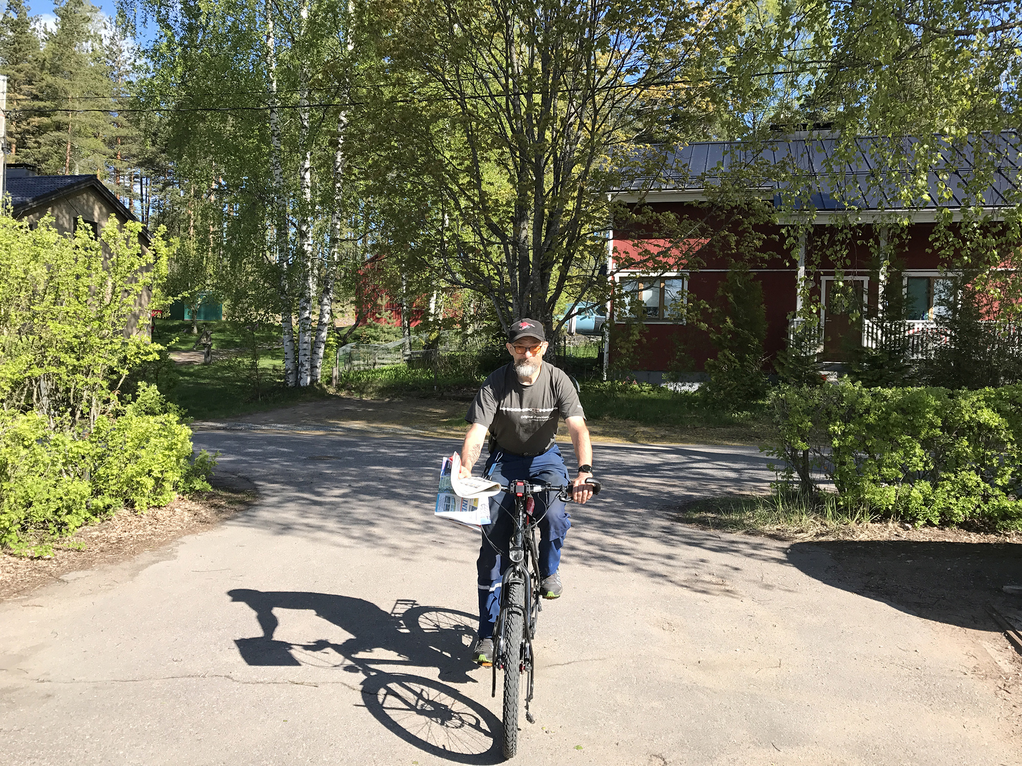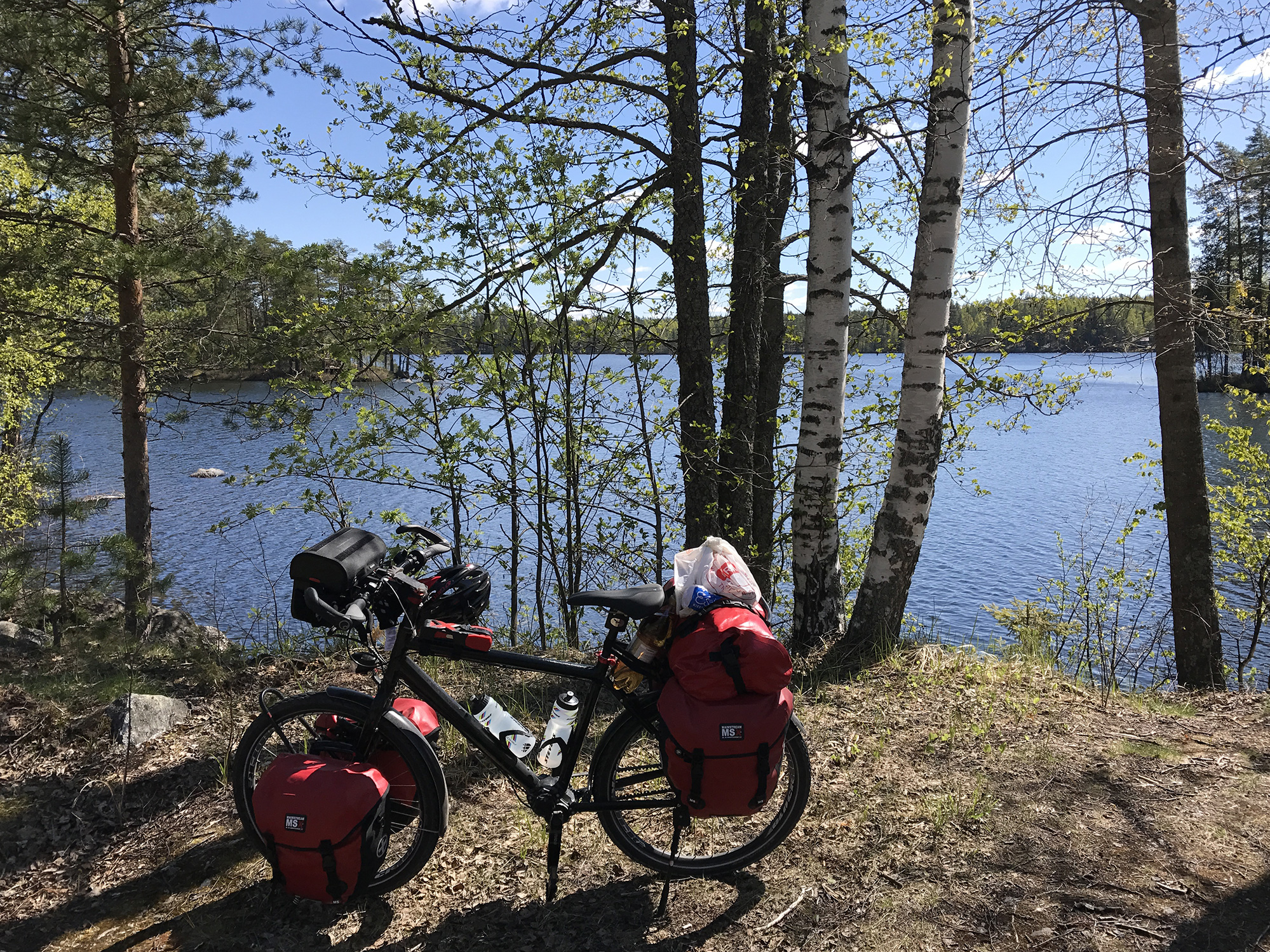 Day 37 Kari’s coffee machine woke me up at 8:30. We had breakfast together and Kari told me of his cycle tours through Europe. Kari has an impressive collection of bikes and an own bicycle workshop. He showed interest for the Pinion gear and carbon drive combination of my bike and took pictures of them. I let him do a short ride to test the gear. Then I had to leave.