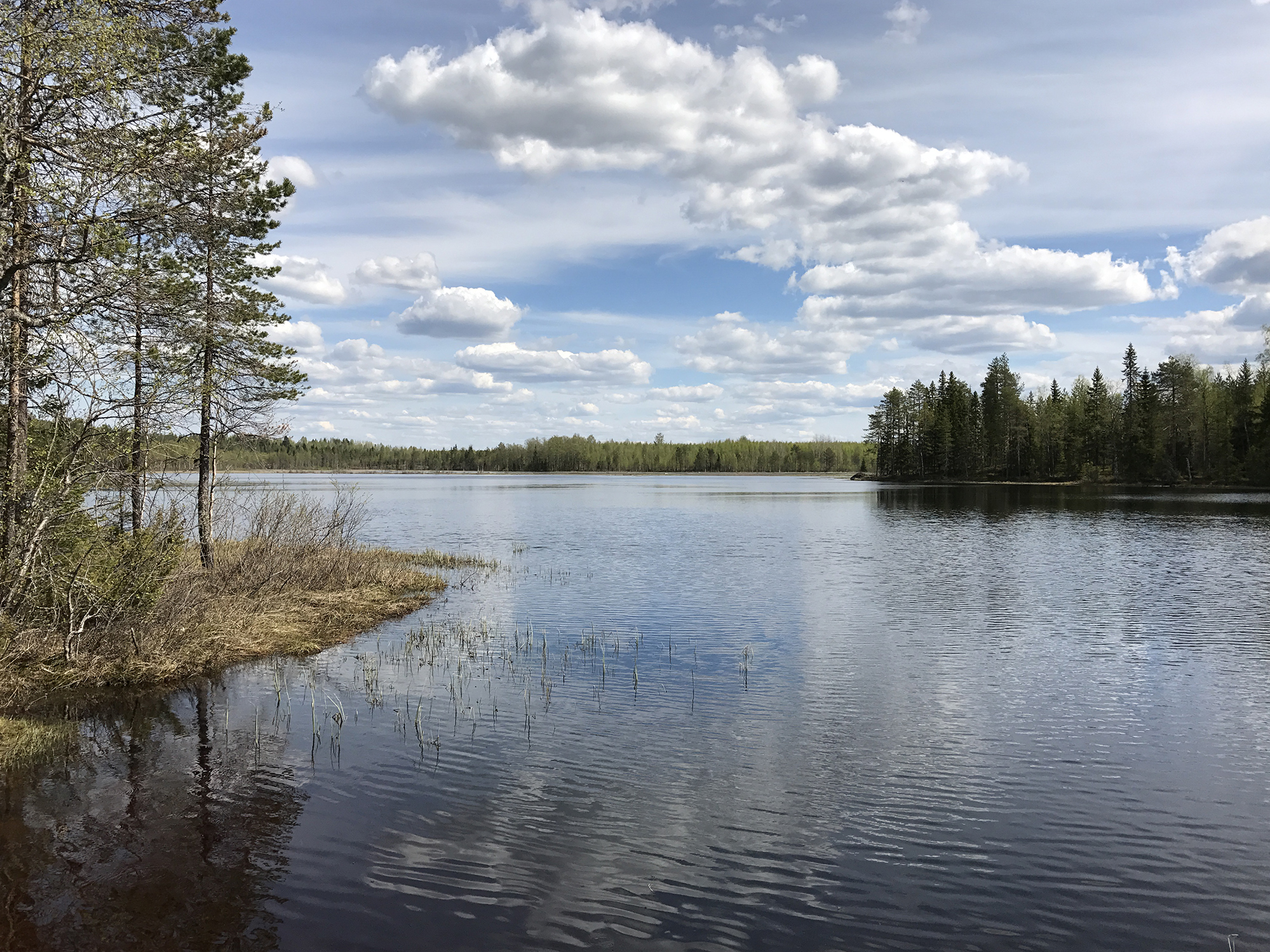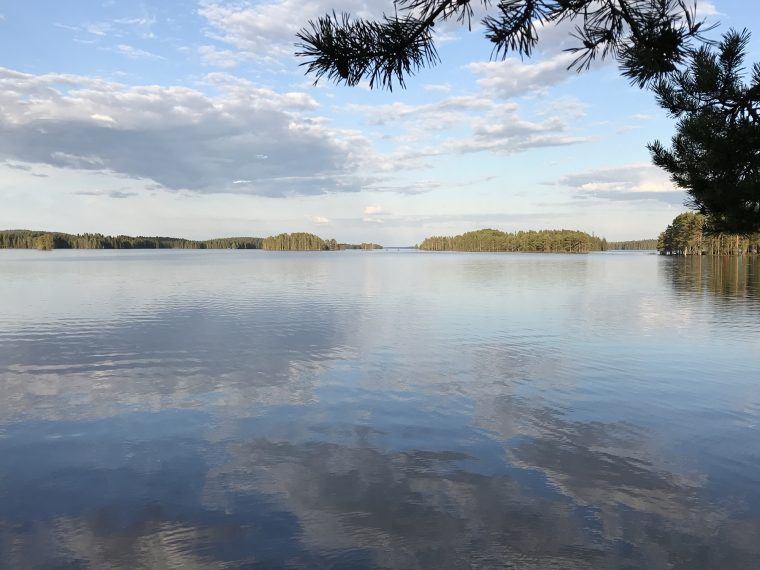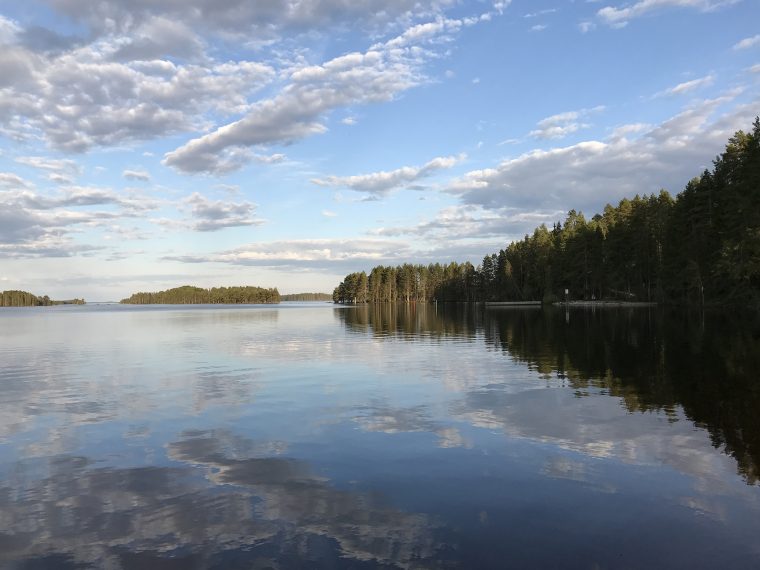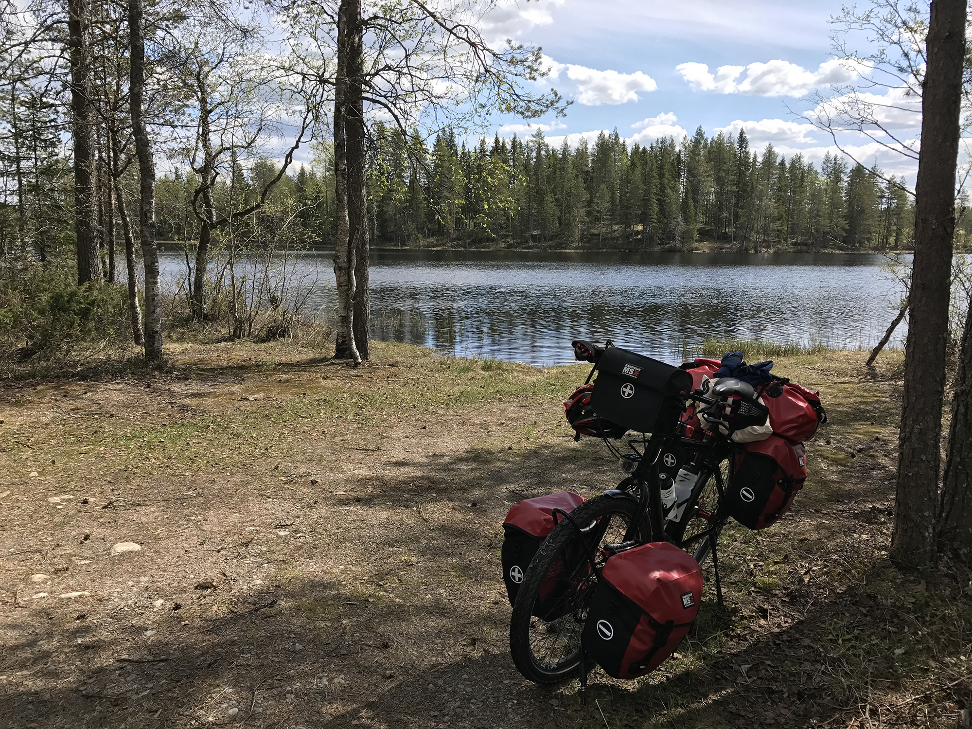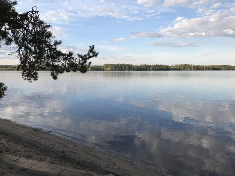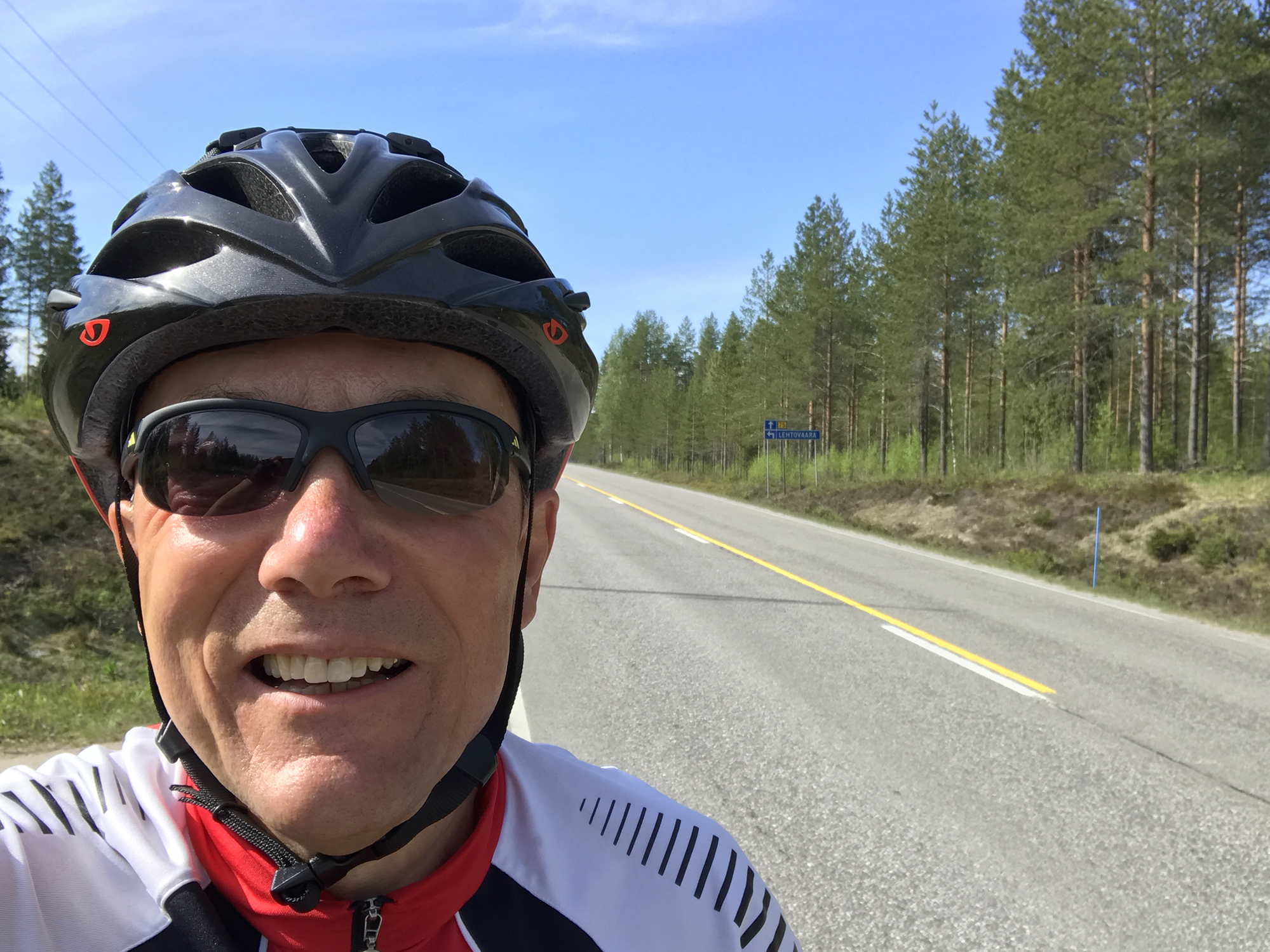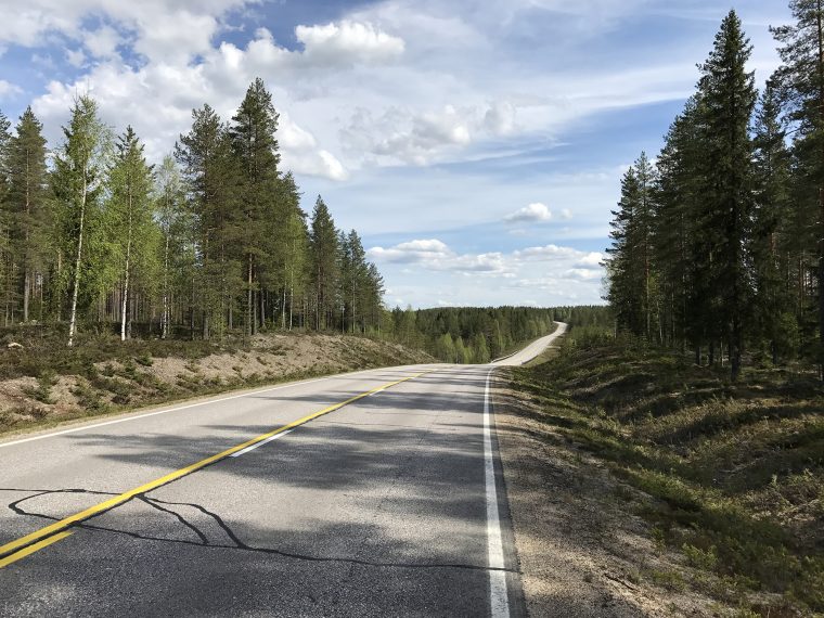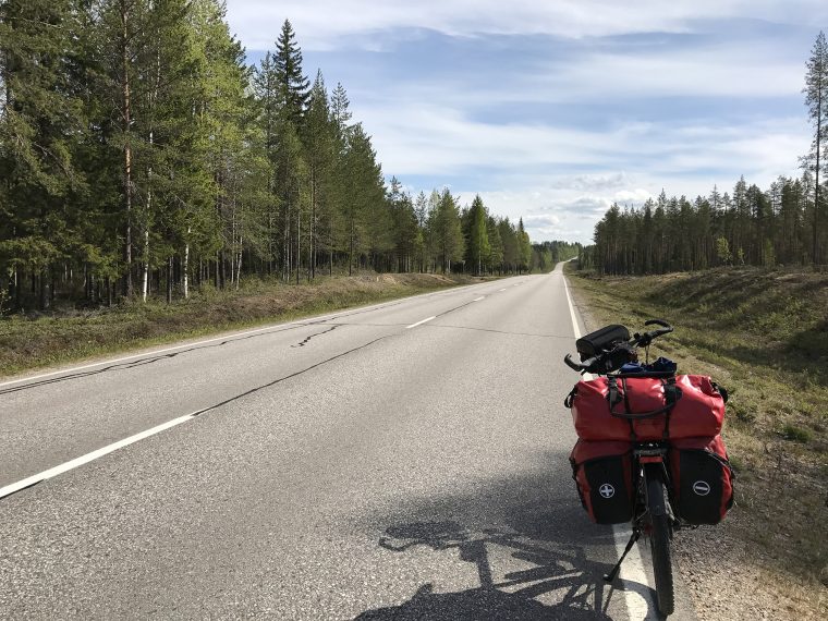Day 43 I spent my cycling day heading north on road 75, excepted for the last few kilometres on road 76 to Kuhmo. I found a good place to take lunch at a lake. In the afternoon, as I was just having a short stop at the top of a hill, I saw a cyclist coming up the slope in front of me and waited until he had reached my position. Because he asked me in English with a well-known accent where I was coming from, I answered him in French. He had started his actual trip from Kirkenes (Norway) and was cycling back to France.