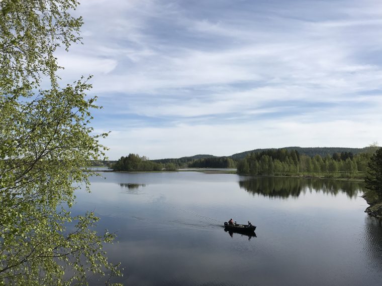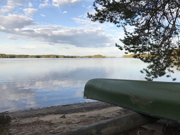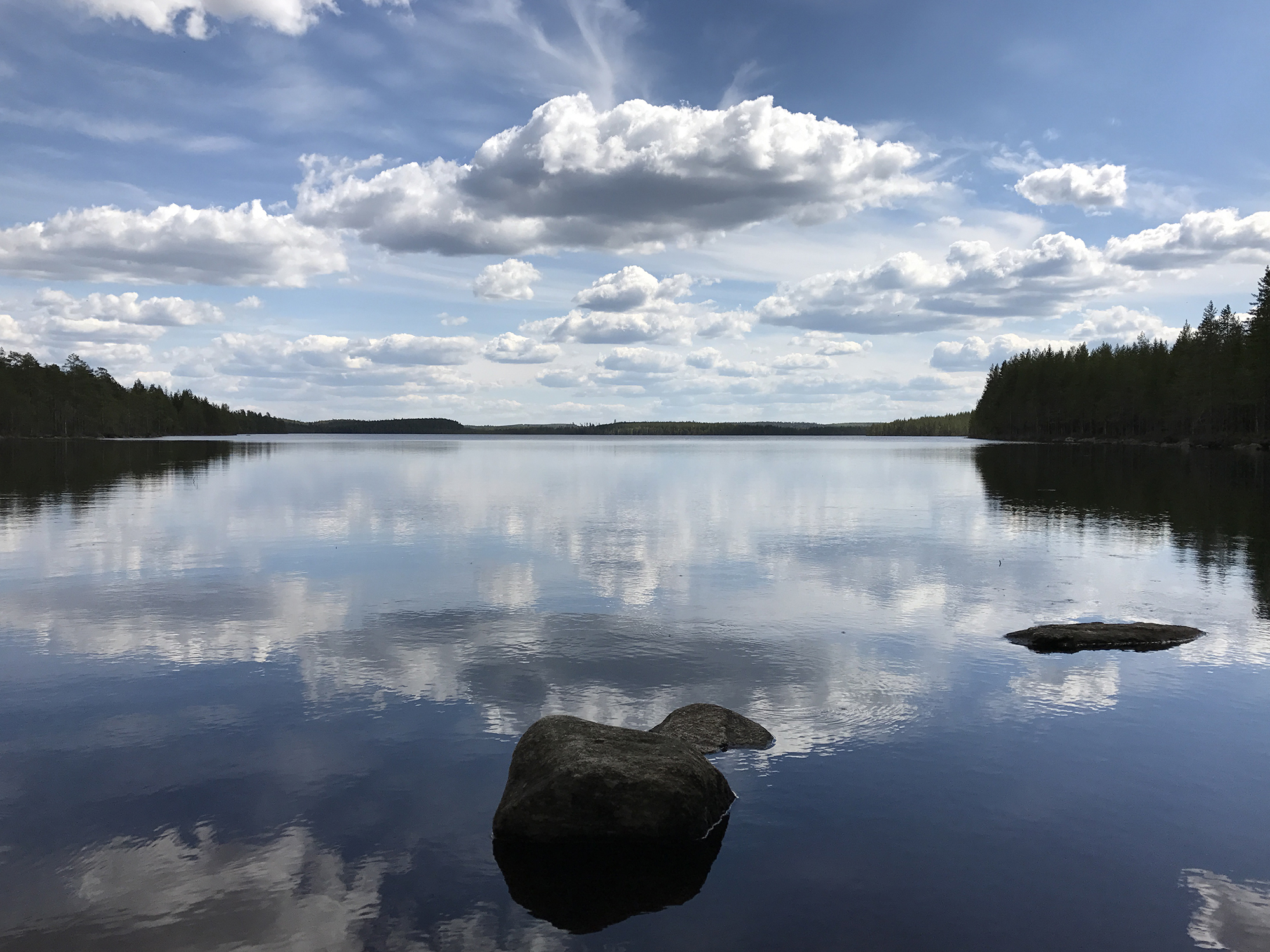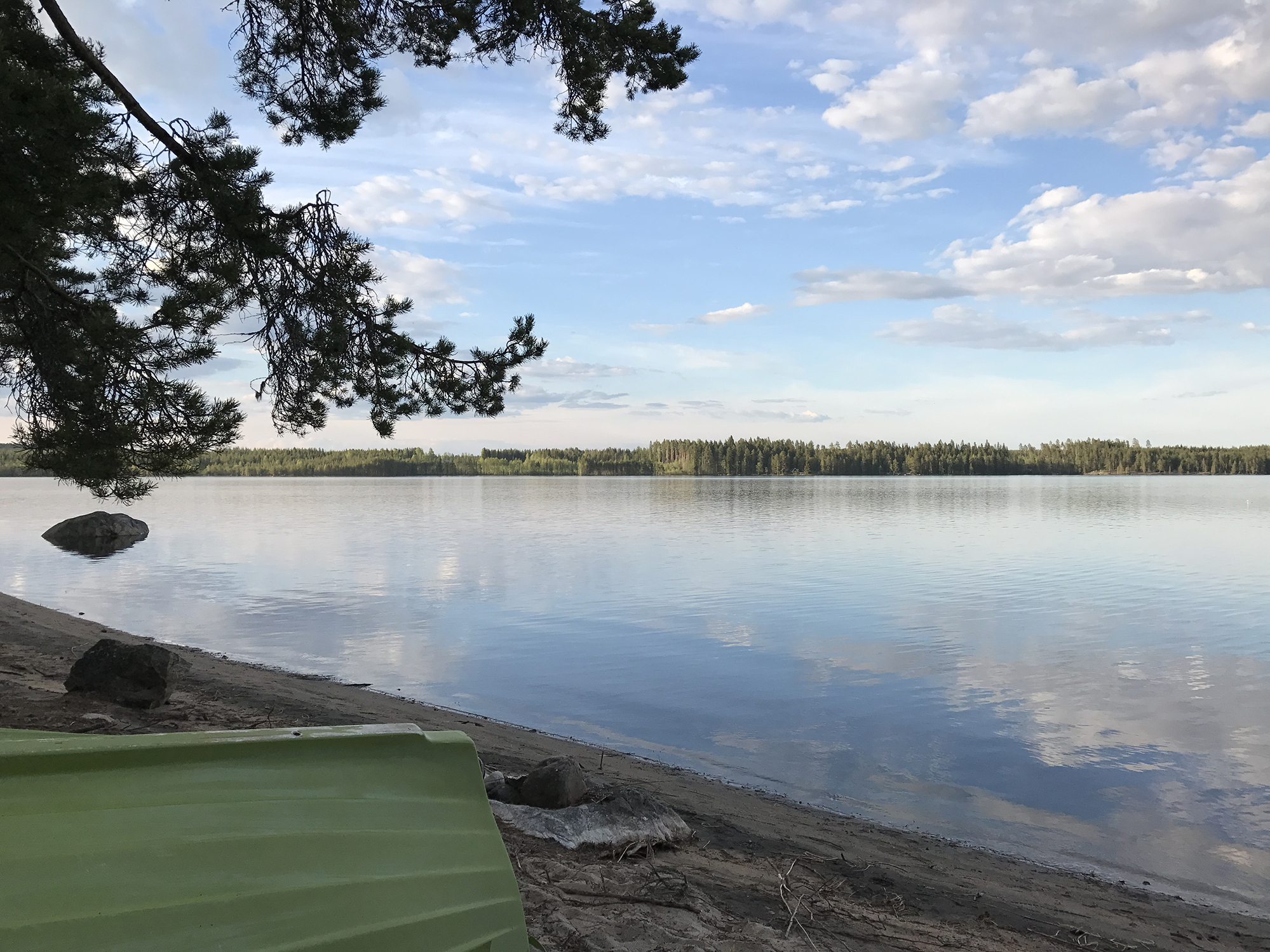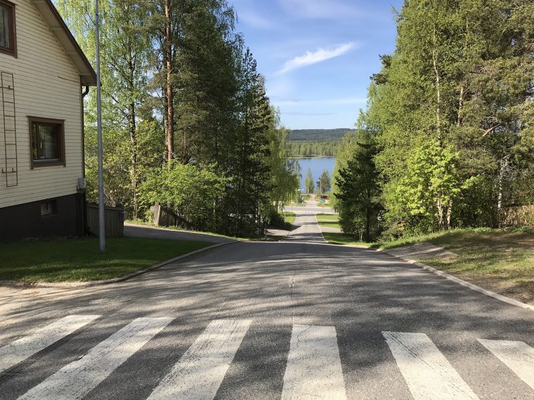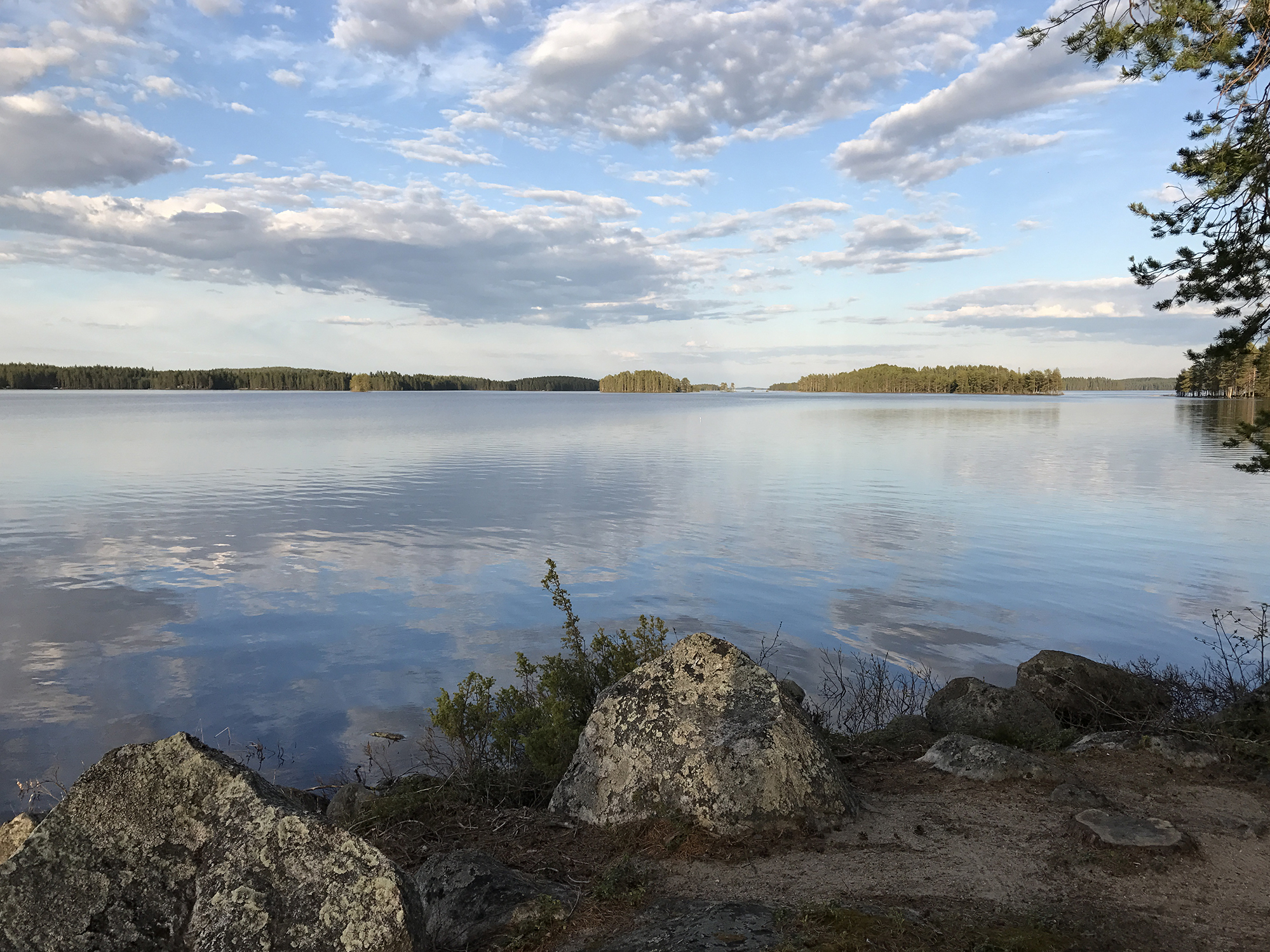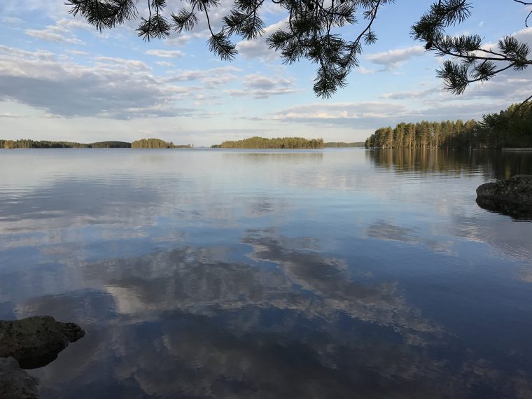 Day 43 I spent my cycling day heading north on road 75, excepted for the last few kilometres on road 76 to Kuhmo. I found a good place to take lunch at a lake. In the afternoon, as I was just having a short stop at the top of a hill, I saw a cyclist coming up the slope in front of me and waited until he had reached my position. Because he asked me in English with a well-known accent where I was coming from, I answered him in French. He had started his actual trip from Kirkenes (Norway) and was cycling back to France.