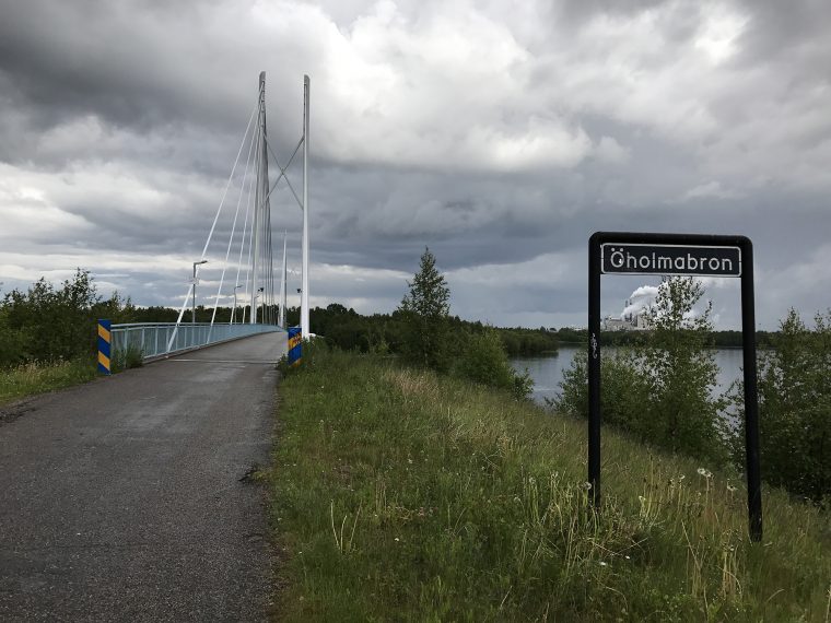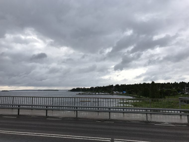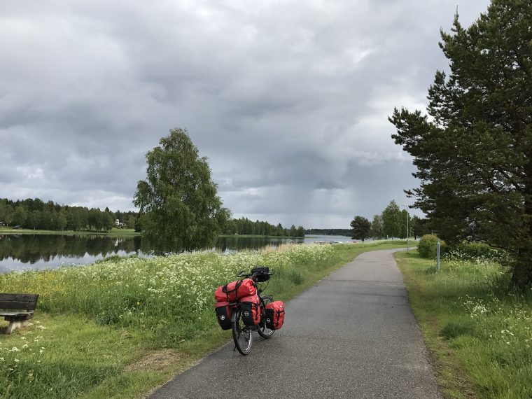 Day 60 I left Luleå around 9am. It had rained during the night and the roads were wet. I had decided to follow the Cykelspåret cycling route to avoid the E4 main road where ever possible. As I came on a cycle way near Luleå ‘s airbase, two Saab fighter jets flew several time above me and it looked as if they had taken my bike as an exercise target. I was cycling through the cyclist friendly Piteå as a heavy rain forced me to look for a shelter. As the rain became lighter I restarted and after a while the rain stopped.