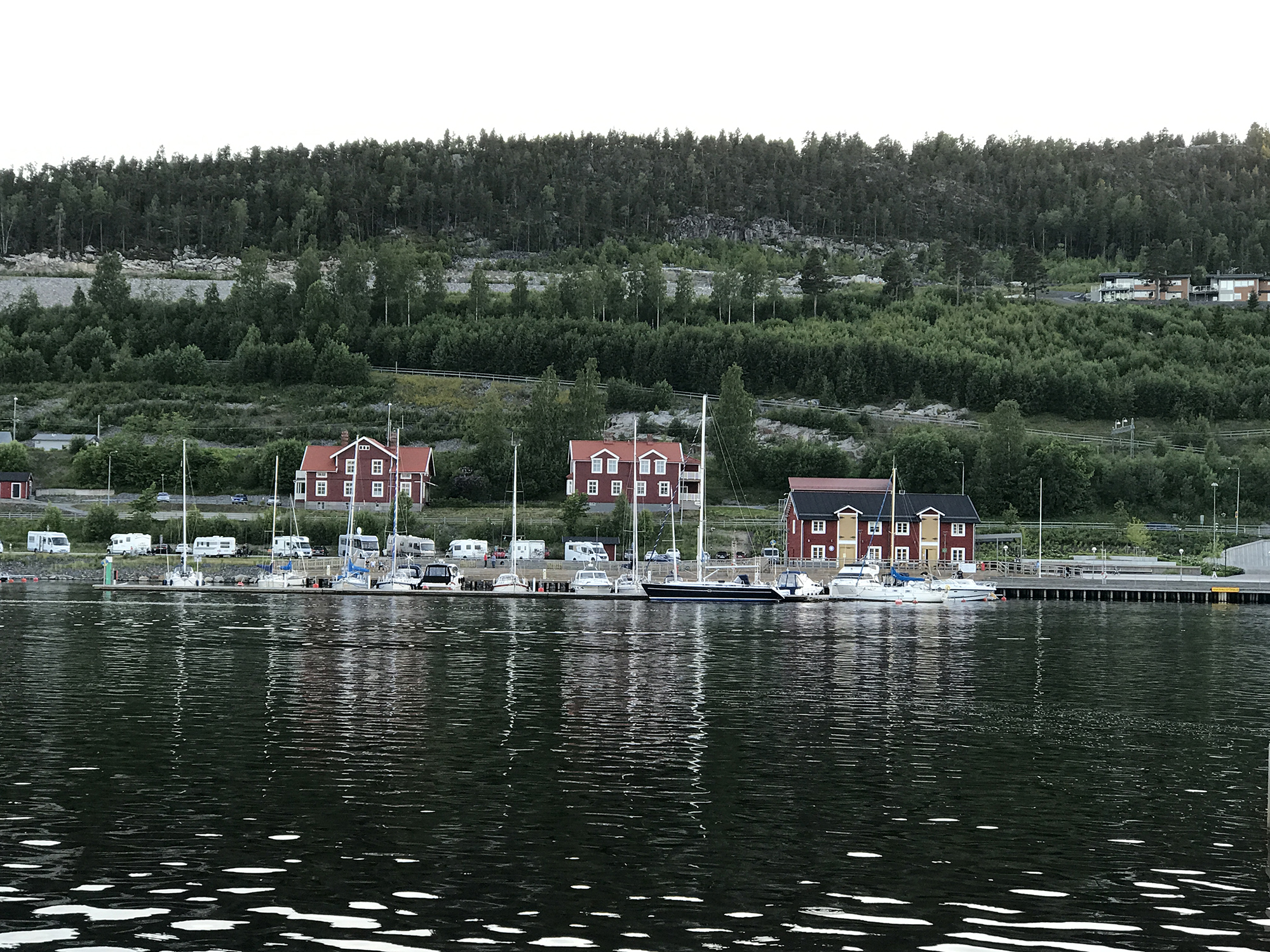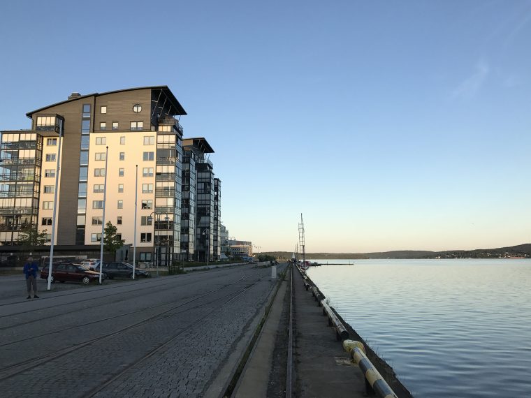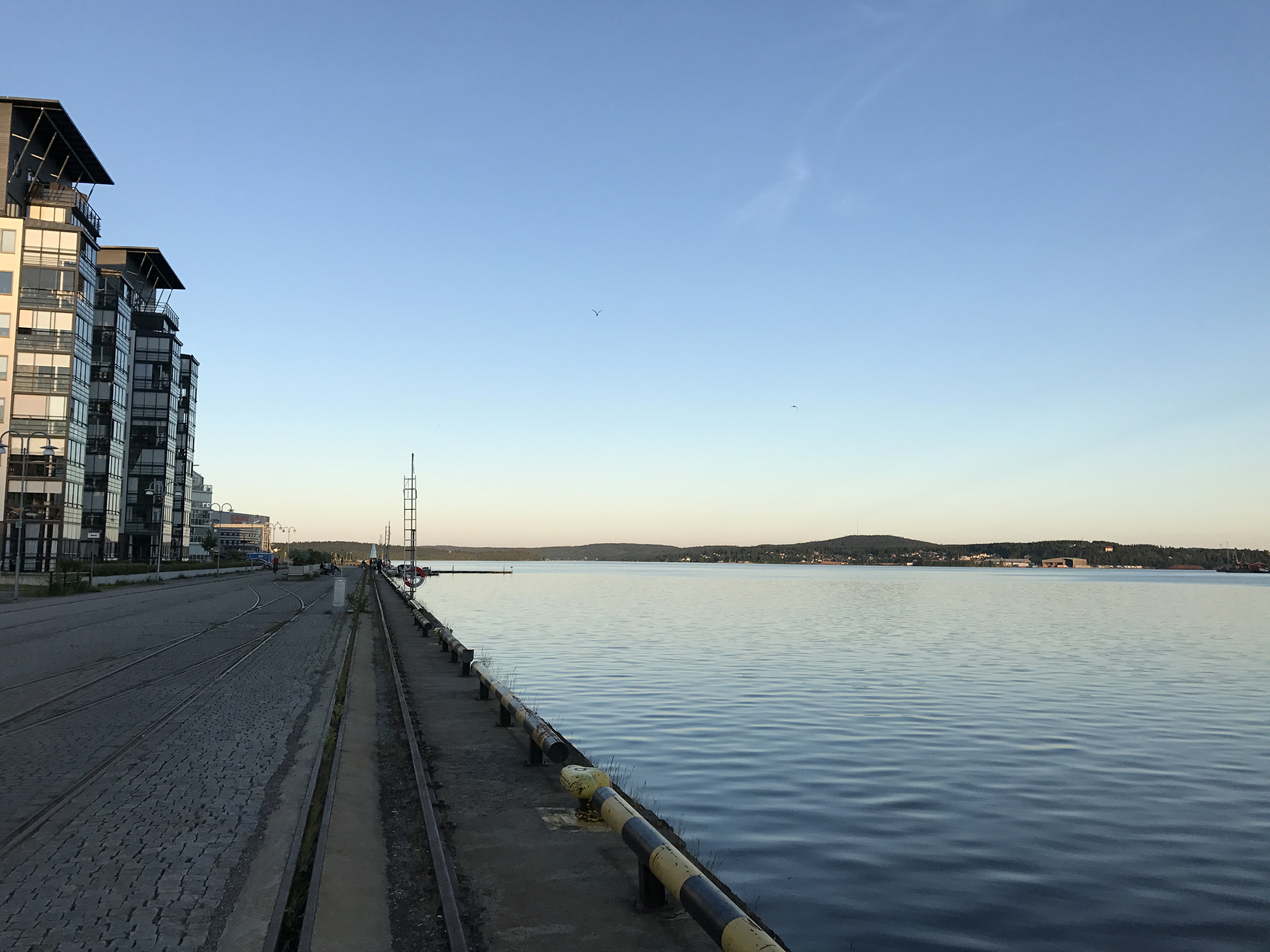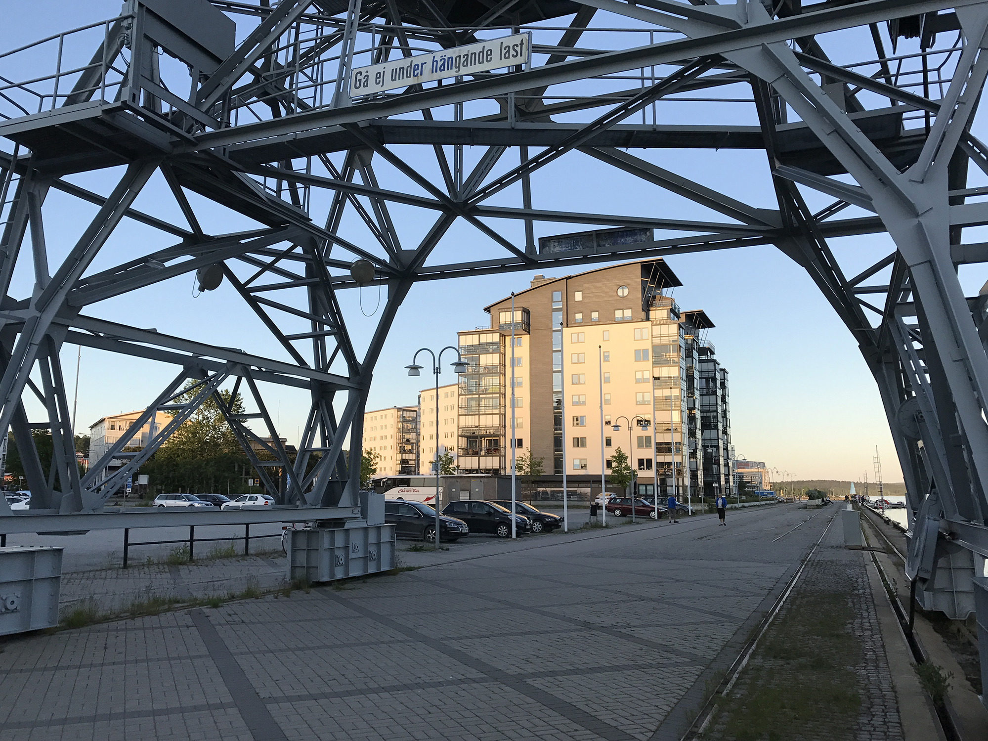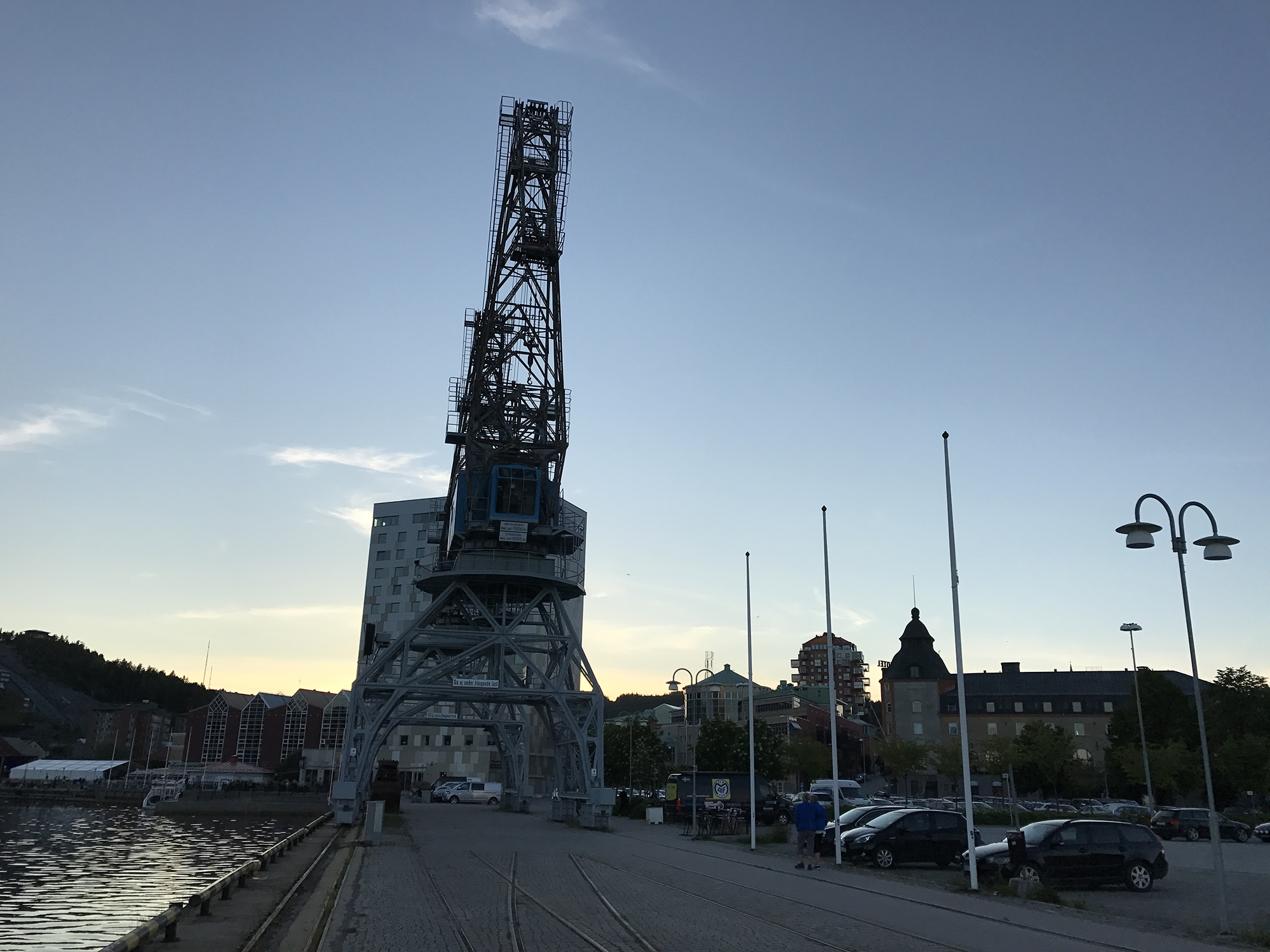 Day 63 After a delayed spartanic breakfast, I left the hotel around 8am and had no problem to get outside of Umeå. The weather was fine, the terrain relatively flat and a tailwind gently pushed me southward. But on the last 50 km I entered the Höga Kusten region and it became more and more hilly. At 6.30pm I reached Örnsköldsvik, the home city of Fjällräven, and the guesthouse. After having taken a refreshing shower I walked downtown for dinner and stopped at a chinese restaurant. After dinner I walked a while along the sea front, where two huge port cranes remind of the former harbour location.
