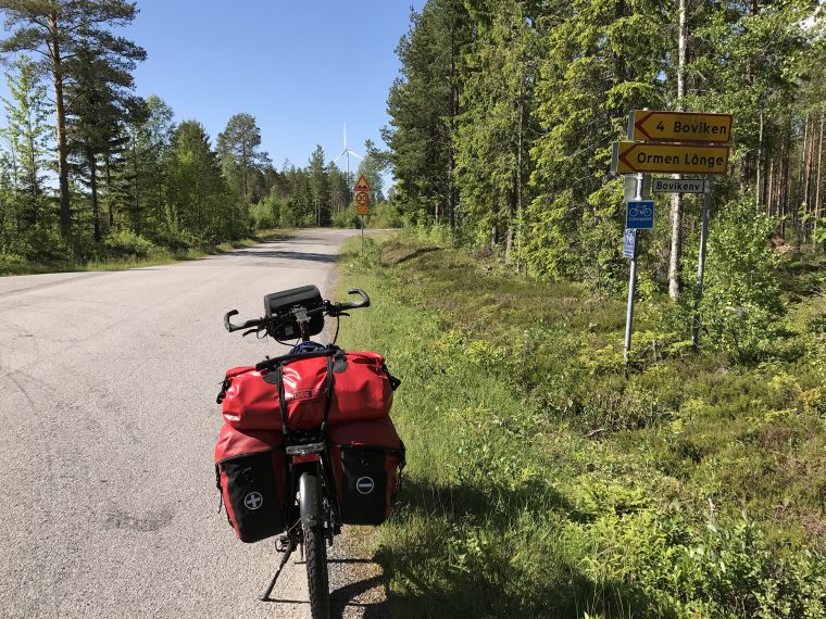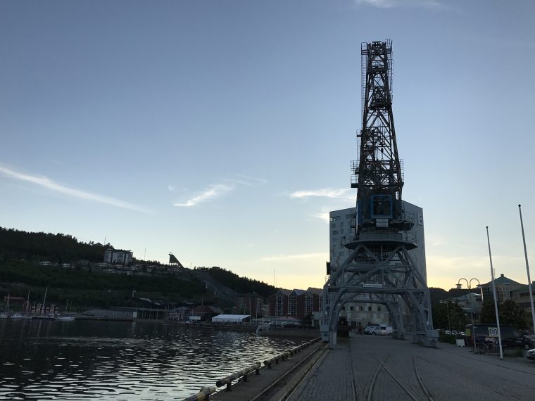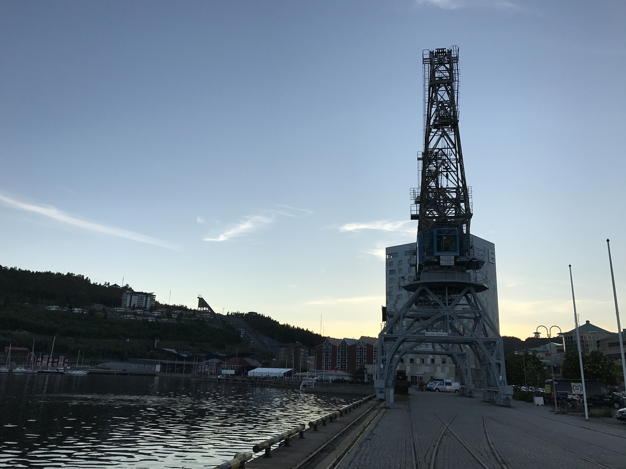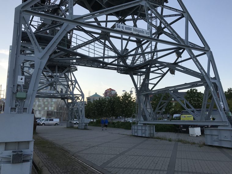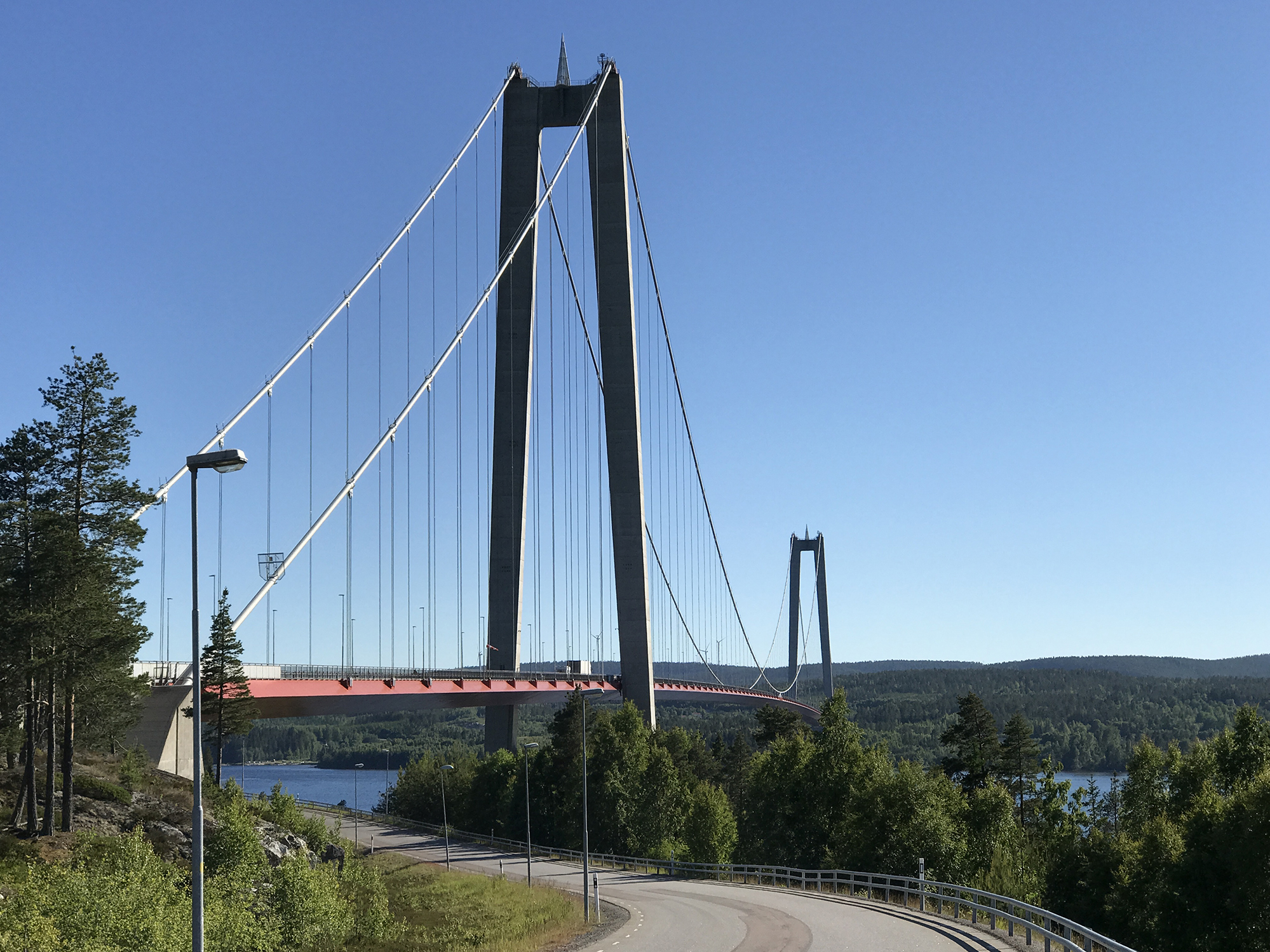 Day 63 After a delayed spartanic breakfast, I left the hotel around 8am and had no problem to get outside of Umeå. The weather was fine, the terrain relatively flat and a tailwind gently pushed me southward. But on the last 50 km I entered the Höga Kusten region and it became more and more hilly. At 6.30pm I reached Örnsköldsvik, the home city of Fjällräven, and the guesthouse. After having taken a refreshing shower I walked downtown for dinner and stopped at a chinese restaurant. After dinner I walked a while along the sea front, where two huge port cranes remind of the former harbour location.