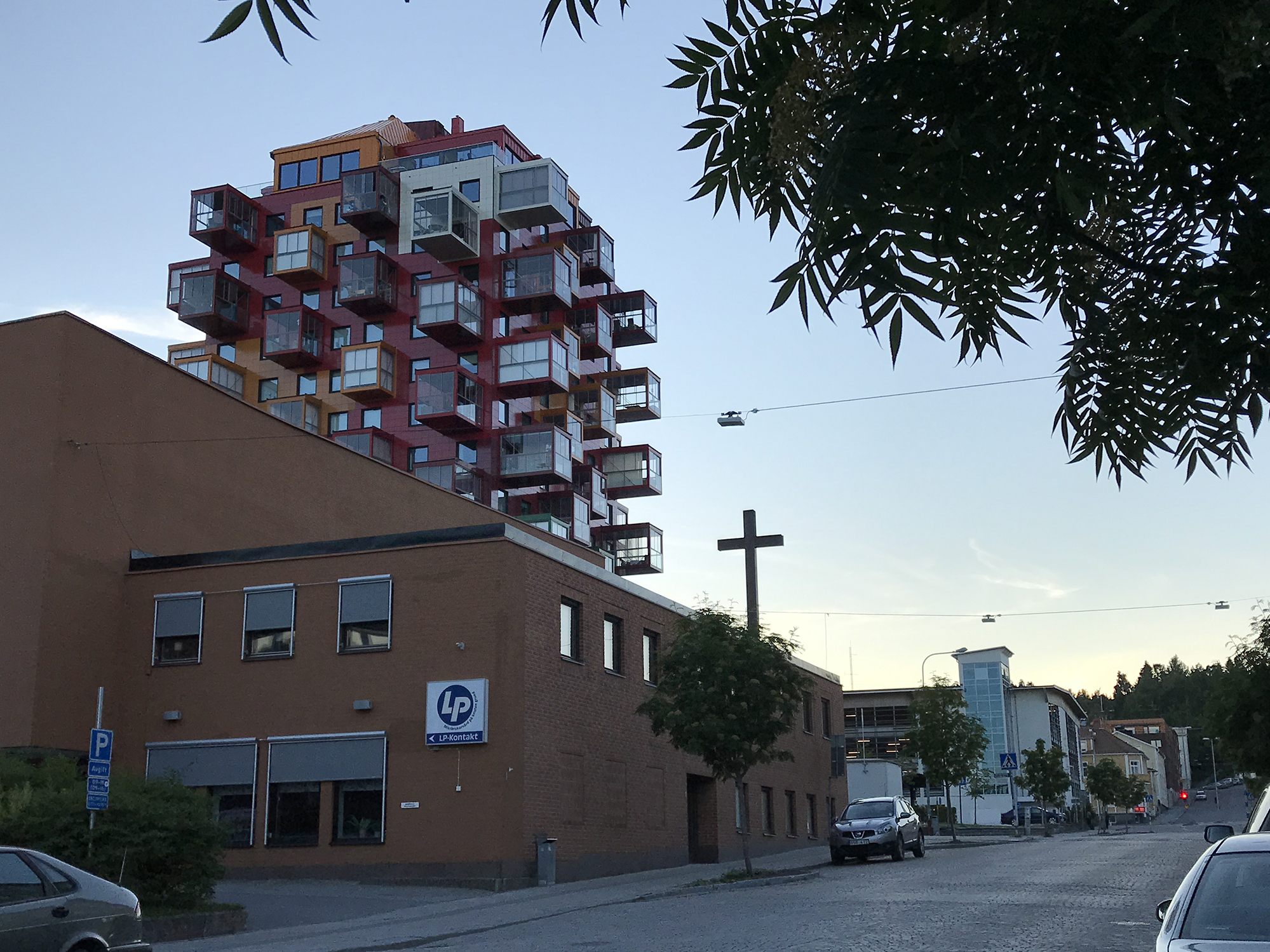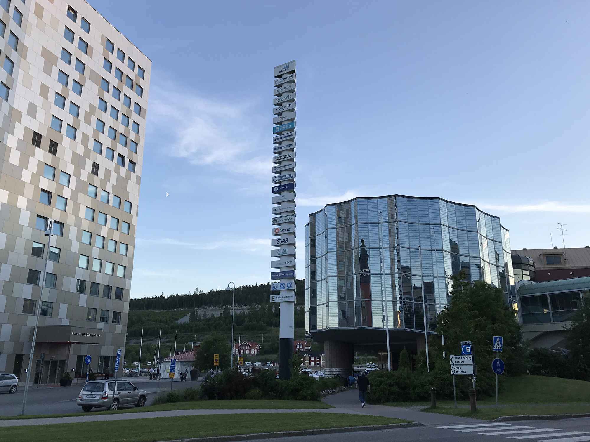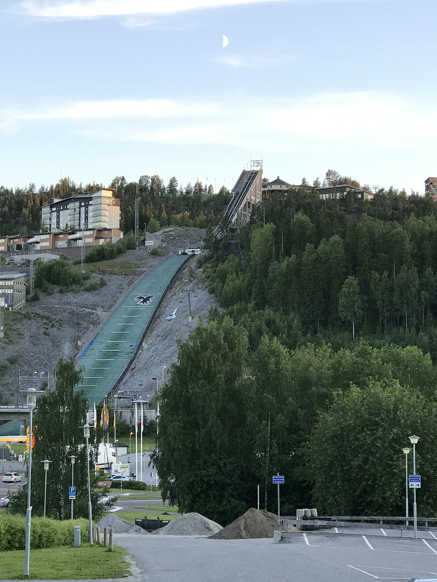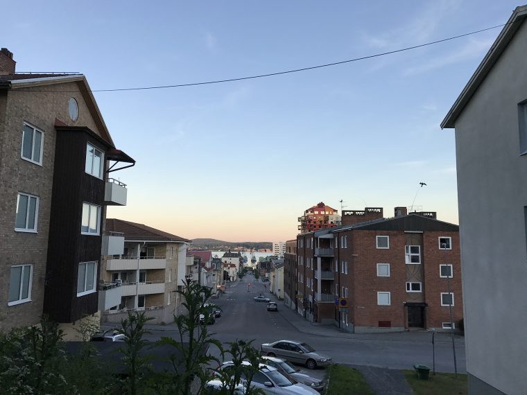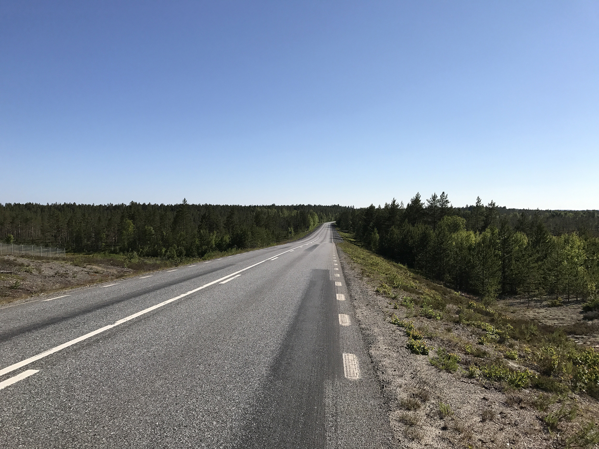 Day 63 After a delayed spartanic breakfast, I left the hotel around 8am and had no problem to get outside of Umeå. The weather was fine, the terrain relatively flat and a tailwind gently pushed me southward. But on the last 50 km I entered the Höga Kusten region and it became more and more hilly. At 6.30pm I reached Örnsköldsvik, the home city of Fjällräven, and the guesthouse. After having taken a refreshing shower I walked downtown for dinner and stopped at a chinese restaurant. After dinner I walked a while along the sea front, where two huge port cranes remind of the former harbour location.