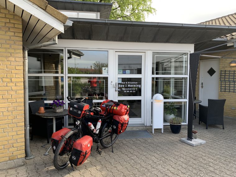 Day 5 After a copious breakfast, I left my friendly B&B host and cycled out of Herning. Weather forecast announced a sunny Sunday with wind from the East at 11 to 17 km/h. Good cycling conditions and a pleasant ride on the cycleway between Herning and Viborg, which follows an ancient railway track. After 199 km I reached a motel near Svenstrup, where I stopped or the night. It was late for dinner in Scandinavia, but I was lucky to get a three course dinner as the last guest of the restaurant.