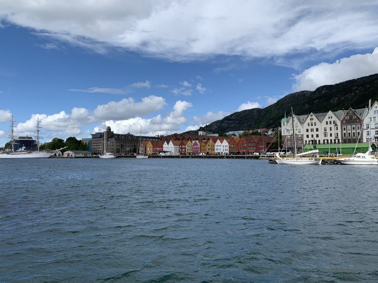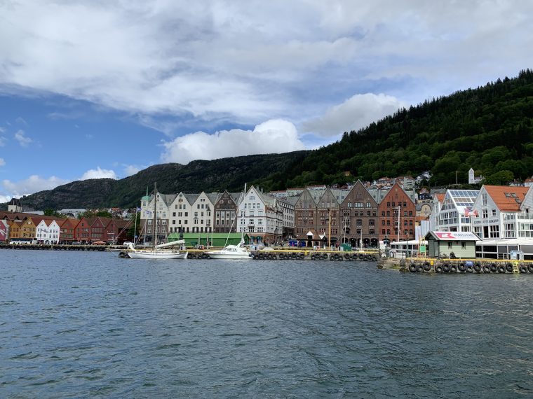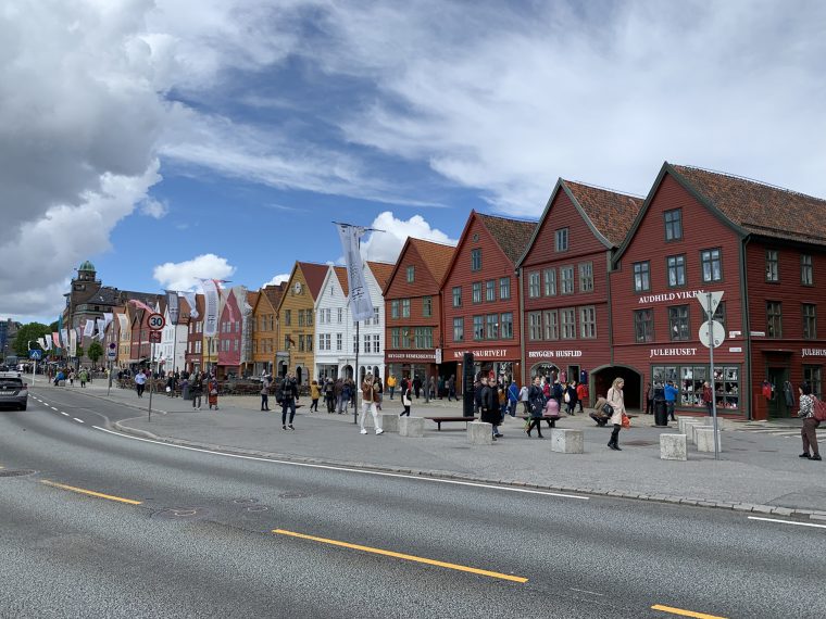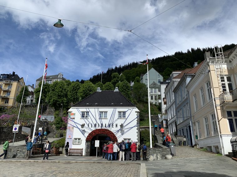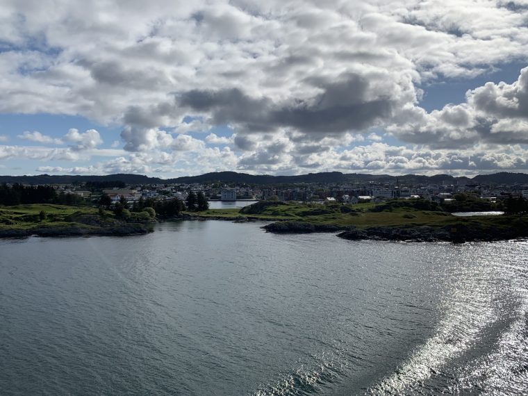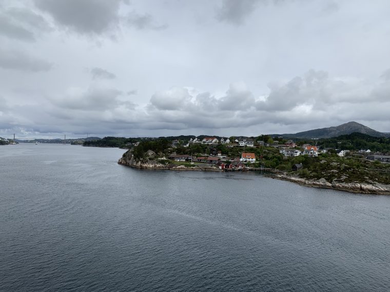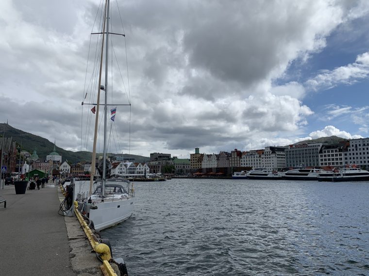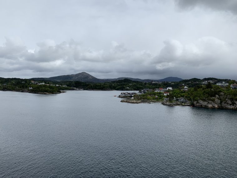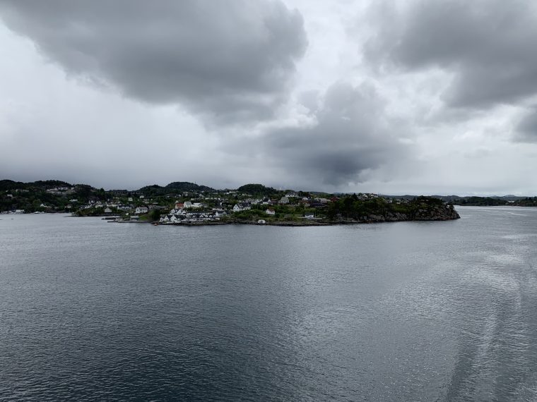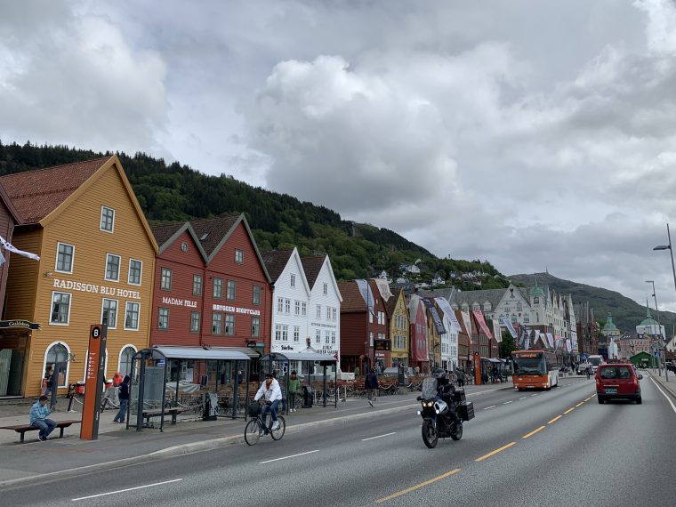 Day 14 It had been raining during the night and as I left the hotel at 6:15 the streets were still wet. I cycled to the other side of the bay and through the industrial port area of Stavanger. As I arrived at the Fjordline Terminal, a few cars were still queuing and 30 minutes later, I boarded the ferry with three further cyclists from Oslo and France and secured my bike on the car deck. The ship left Stavanger and headed northward between the islands. I ate my packaged breakfast on the upper deck, enjoying the sunshine and the clear view. As we came closer to Bergen, the sky became more and more cloudy and as the ship finally moored in the port of Bergen around 12.30 it started to rain, temperature having dropped to 8°C. I left the ferry with the other cyclists and we headed to the town center. At a junction, we separated and I followed the voice instructions from my fellow Komoot app to reach my night shelter. I had booked a room in a hotel situated in the middle of a shopping mall. After some hesitation, I pushed my bike into the mall, looking for the hotel reception. People around me were wondering, what I was doing there with my heavy-loaded bike. I finally found the reception desk close to the main elevator in the middle of the first floor. I checked in, took the elevator to the second floor and pushed the bike into the hotel room. Well done!