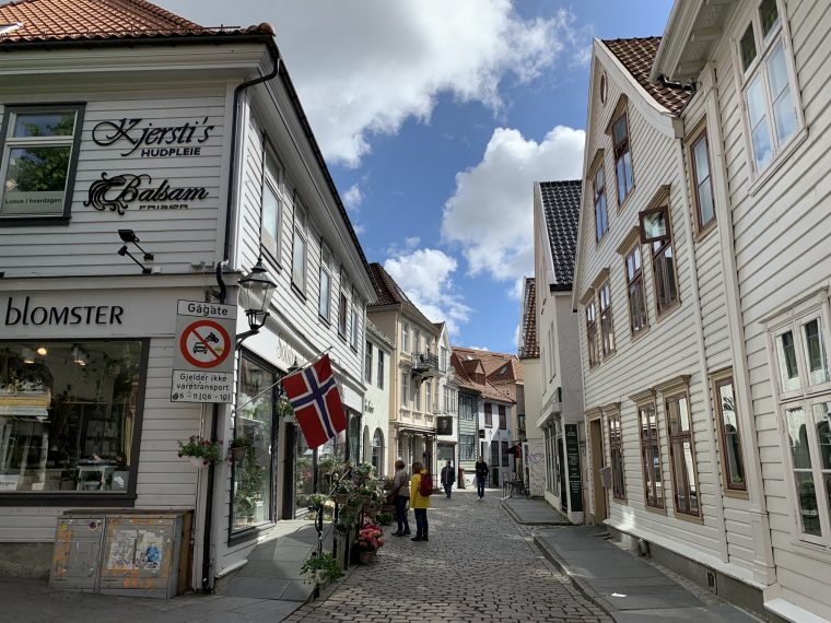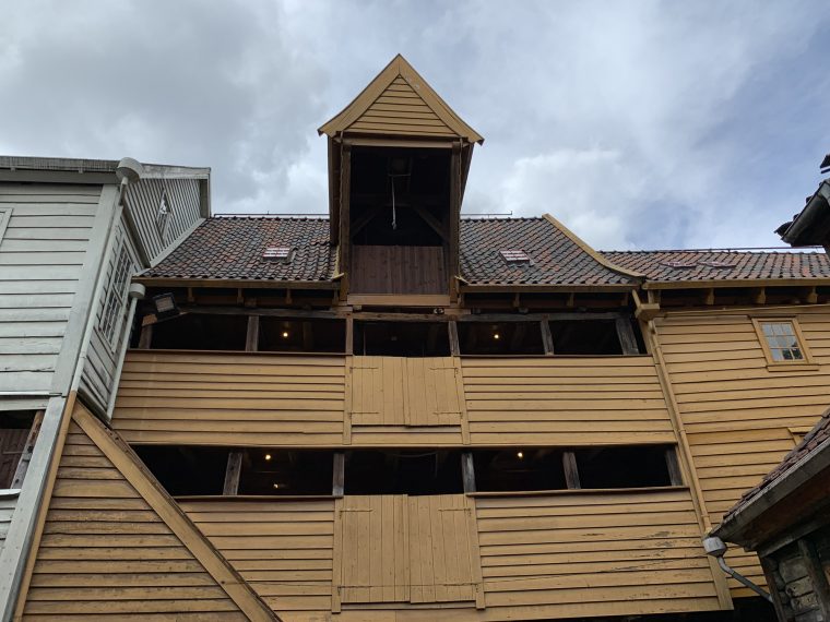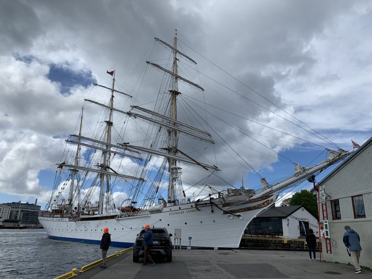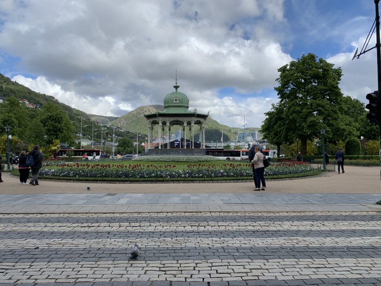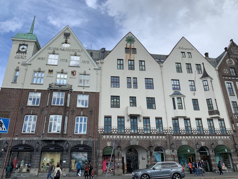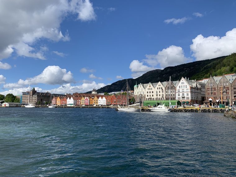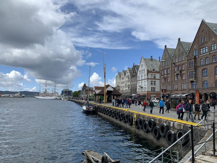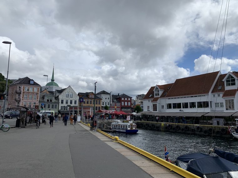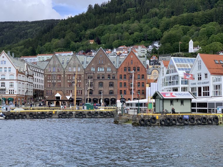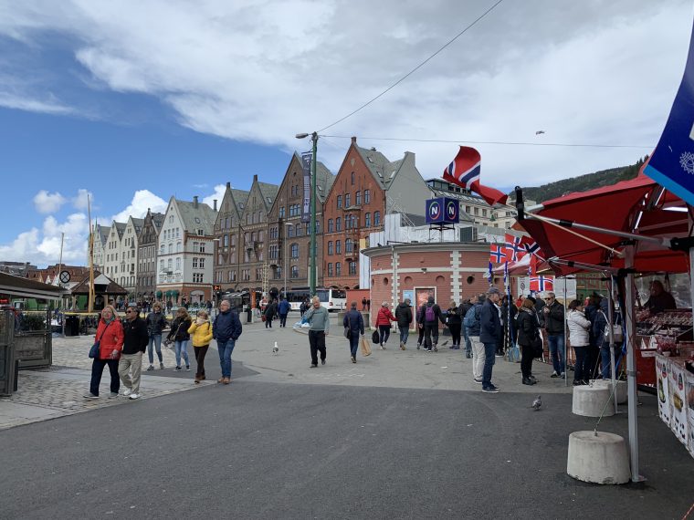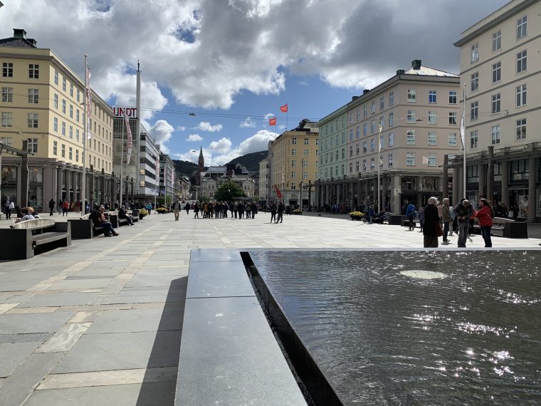 Day 14 It had been raining during the night and as I left the hotel at 6:15 the streets were still wet. I cycled to the other side of the bay and through the industrial port area of Stavanger. As I arrived at the Fjordline Terminal, a few cars were still queuing and 30 minutes later, I boarded the ferry with three further cyclists from Oslo and France and secured my bike on the car deck. The ship left Stavanger and headed northward between the islands. I ate my packaged breakfast on the upper deck, enjoying the sunshine and the clear view. As we came closer to Bergen, the sky became more and more cloudy and as the ship finally moored in the port of Bergen around 12.30 it started to rain, temperature having dropped to 8°C. I left the ferry with the other cyclists and we headed to the town center. At a junction, we separated and I followed the voice instructions from my fellow Komoot app to reach my night shelter. I had booked a room in a hotel situated in the middle of a shopping mall. After some hesitation, I pushed my bike into the mall, looking for the hotel reception. People around me were wondering, what I was doing there with my heavy-loaded bike. I finally found the reception desk close to the main elevator in the middle of the first floor. I checked in, took the elevator to the second floor and pushed the bike into the hotel room. Well done!