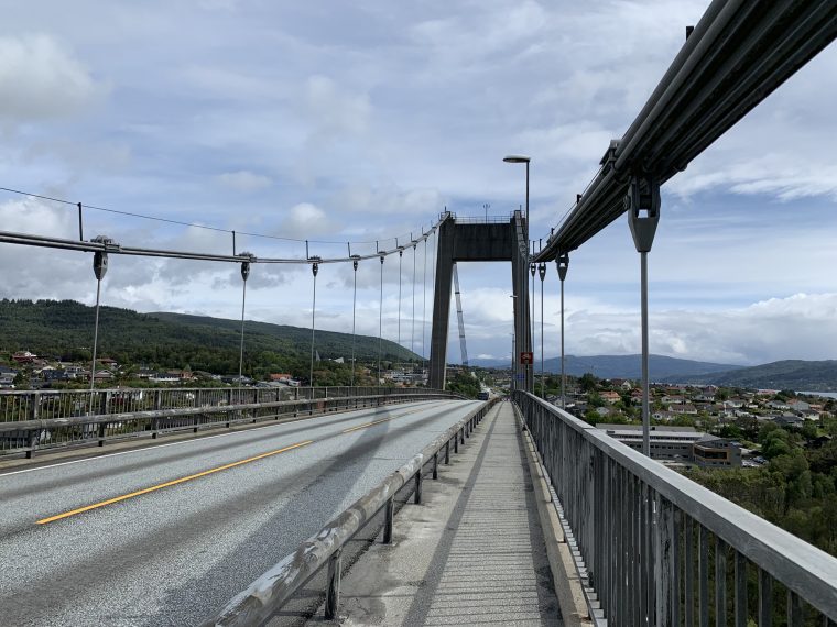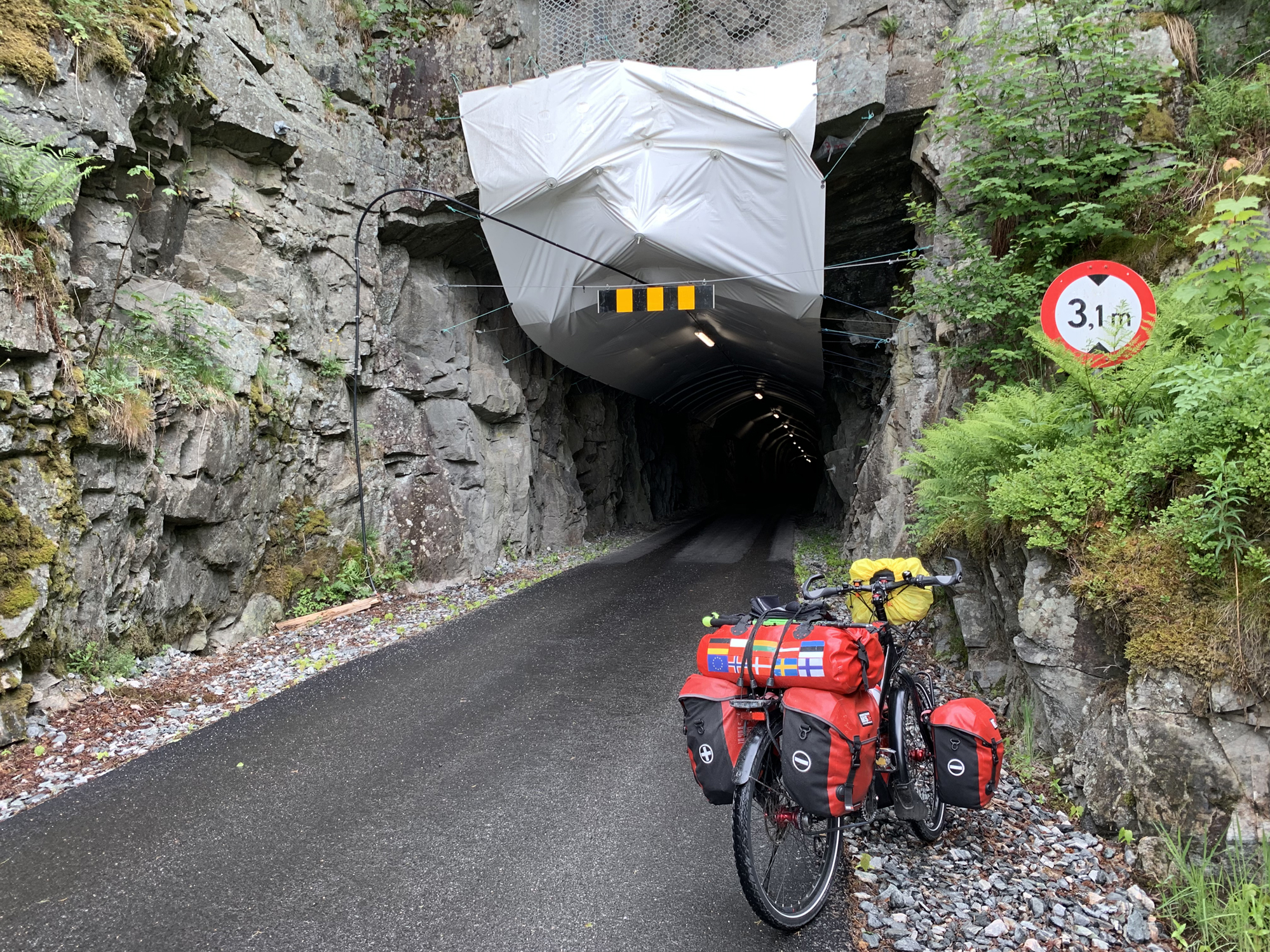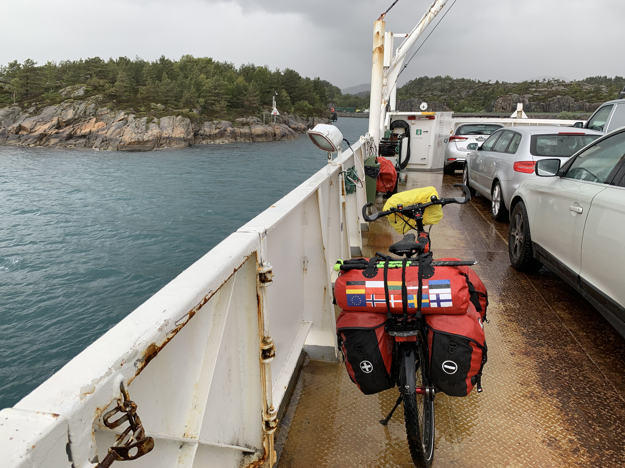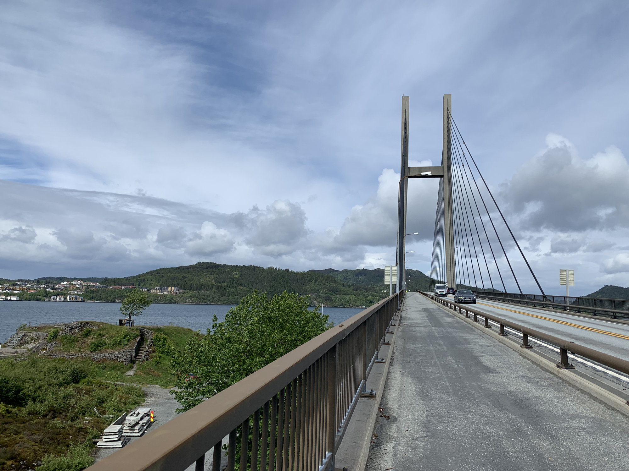 Ten kilometers after having crossed the Salhusfjord I remarked that the rear brake was not working well. I checked the brake pads, which looked quite new after 1000 km. There was no shelter to hide from the pouring rain and I decided to continue, having planned to spend the night at a camping site being still 85 km away.