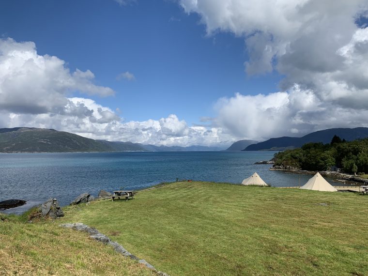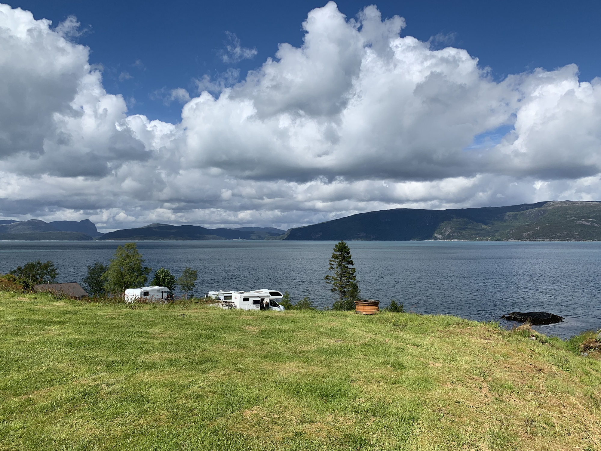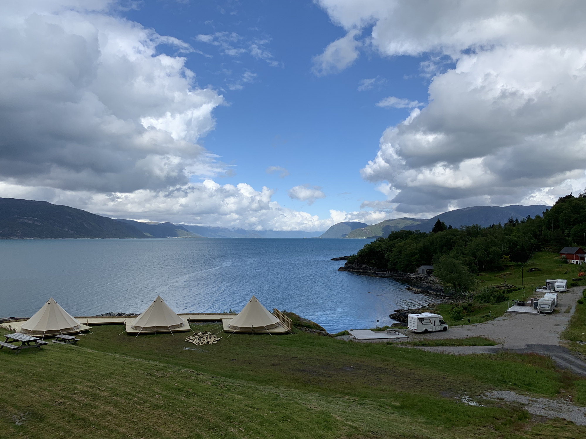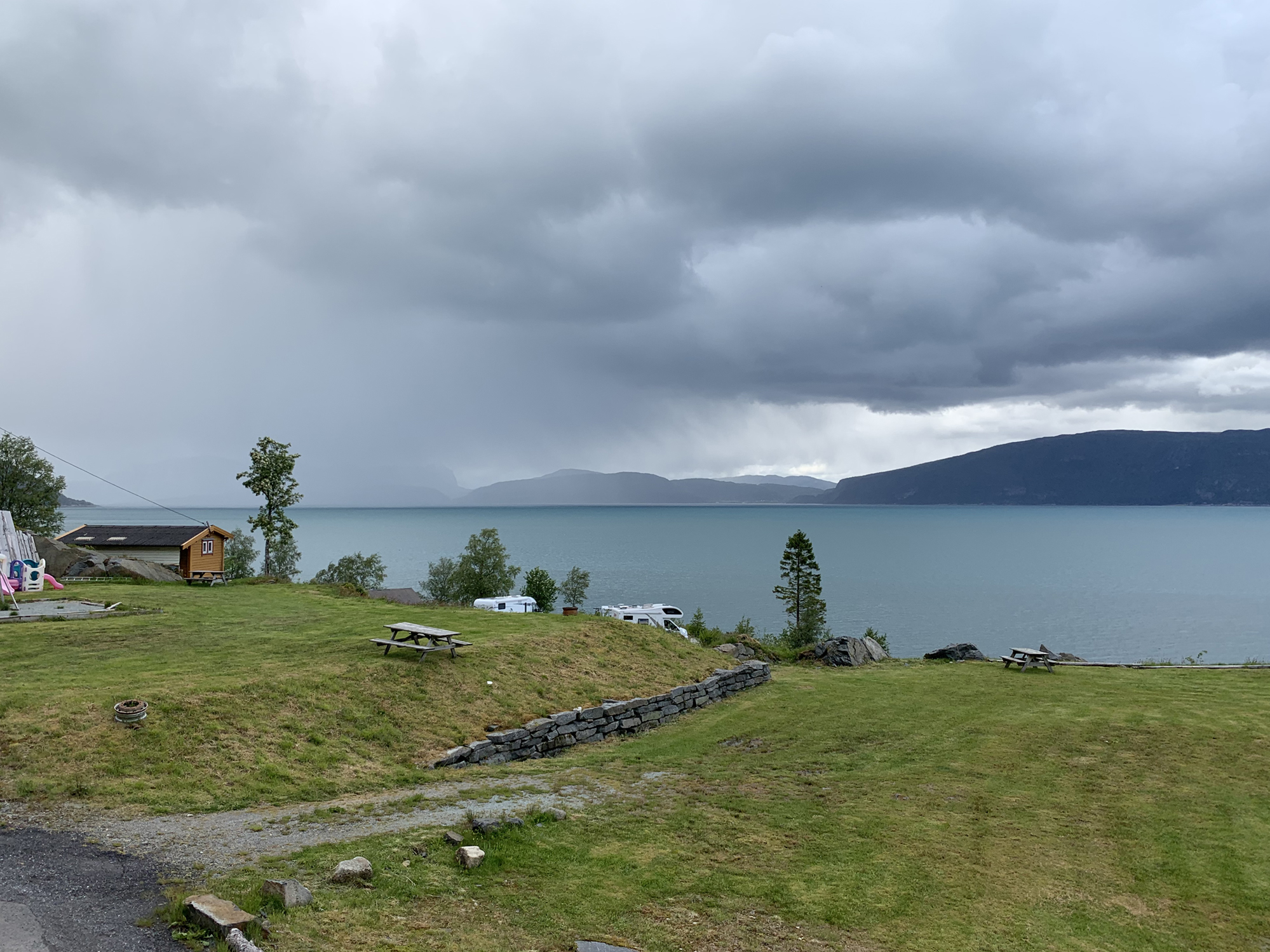 In the afternoon, after 70 km I boarded the ferry from Leirvåg to Sløvåg across the Fensfjord. It was still raining and there was no place to rest during the 20 min crossing. It was somehow uncomfortable. I left the ferry and there was few traffic on the road leading to the next ferry crossing in Rutledal. Meanwhile the rear brake had stopped working. In Leversund I turned into the Austgulvegen. I passed the Austgulen village and the rain intensified. The narrow road was now climbing up the mountain. As it became too steep, I had to push my bike. Water was rushing down the road and my feet became wet despite the shoes covers. Lightnings and thunderstorm announced a weather change. Rain became gale and gale went into snow. I reached the pass and without rear brake undertook with caution the descent toward the fjord. The front wheel was shaking and the sole functioning break groaning with despair. My frozen fingers were hurting. With relief I finally reached the shore of the Sognefjord, turned left and arrived at the Brekke camping a few minutes later.