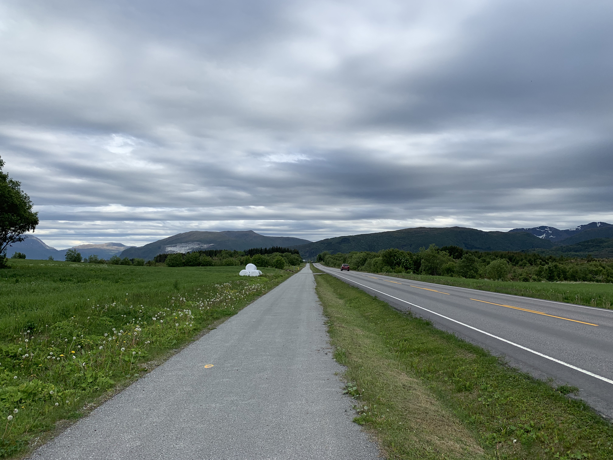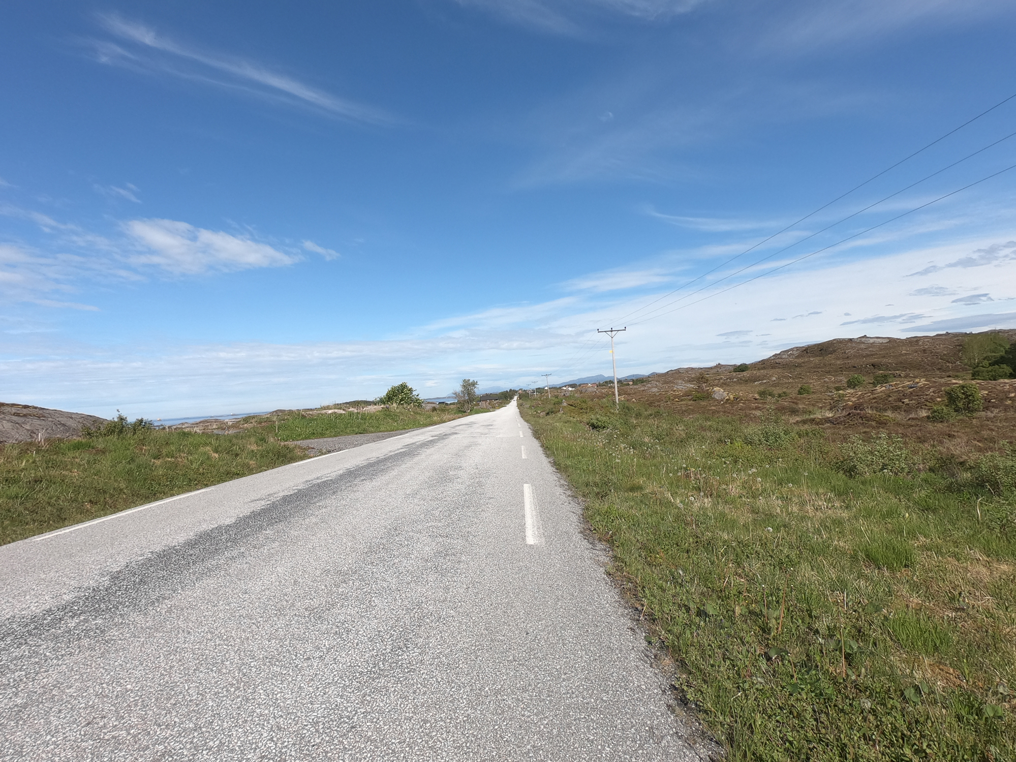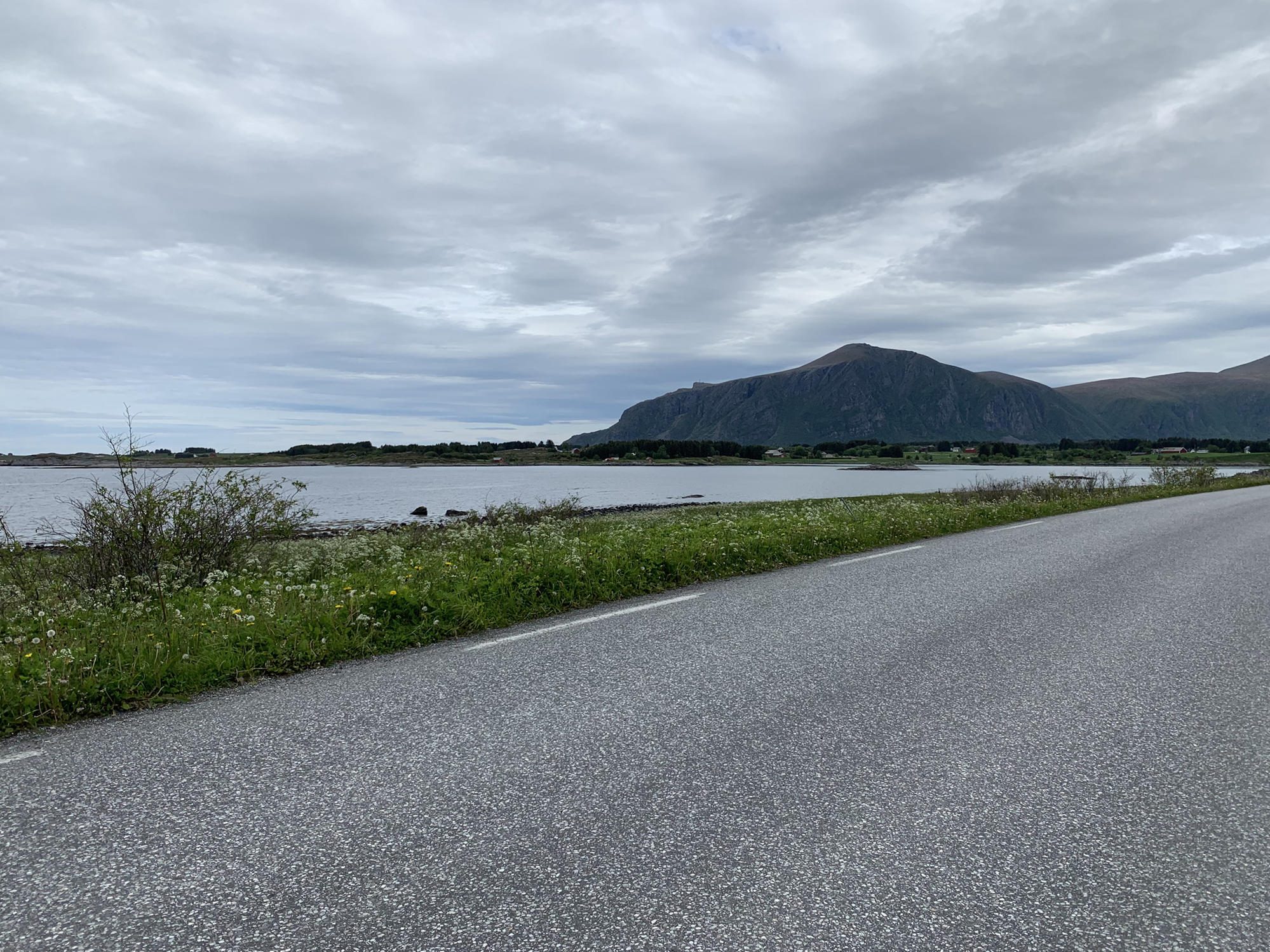 Day 22 I left the Airbnb around 10am and took a quiet road along the coast. Short after having left Molde it started to rain and it kept raining until 3pm. The wind blowed the rain clouds away and during one hour I enjoyed sunshine. But it became again cloudy as I reached Vevang around 4pm.