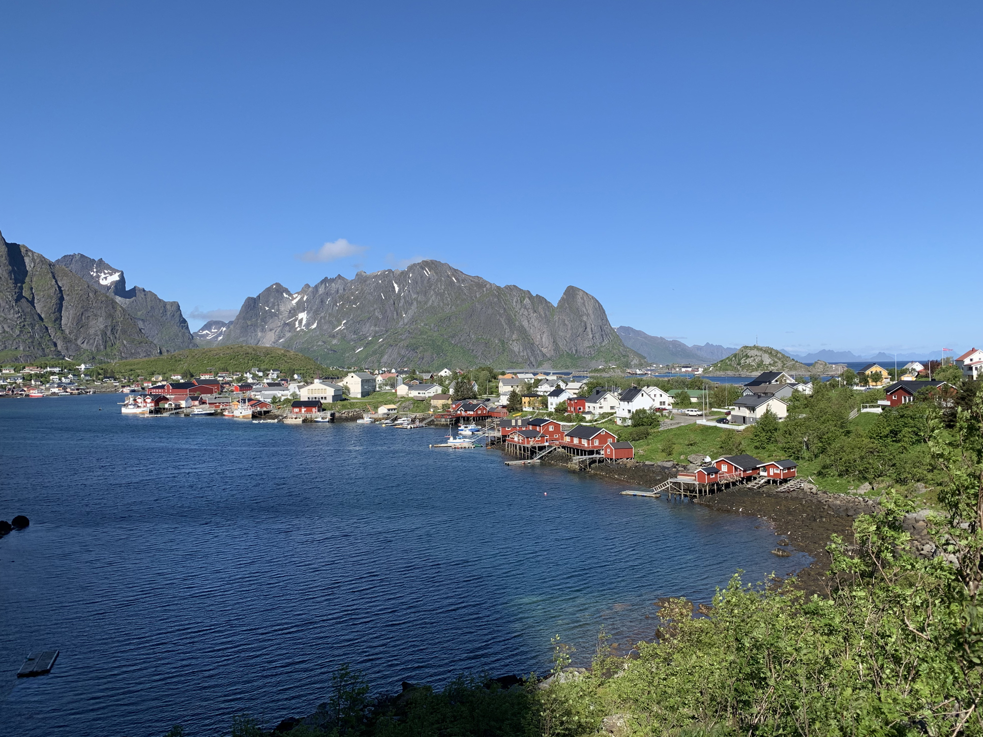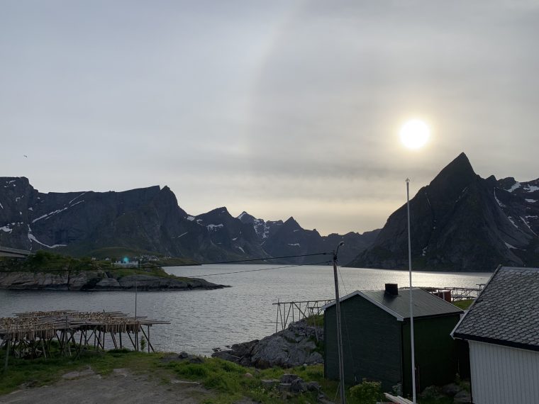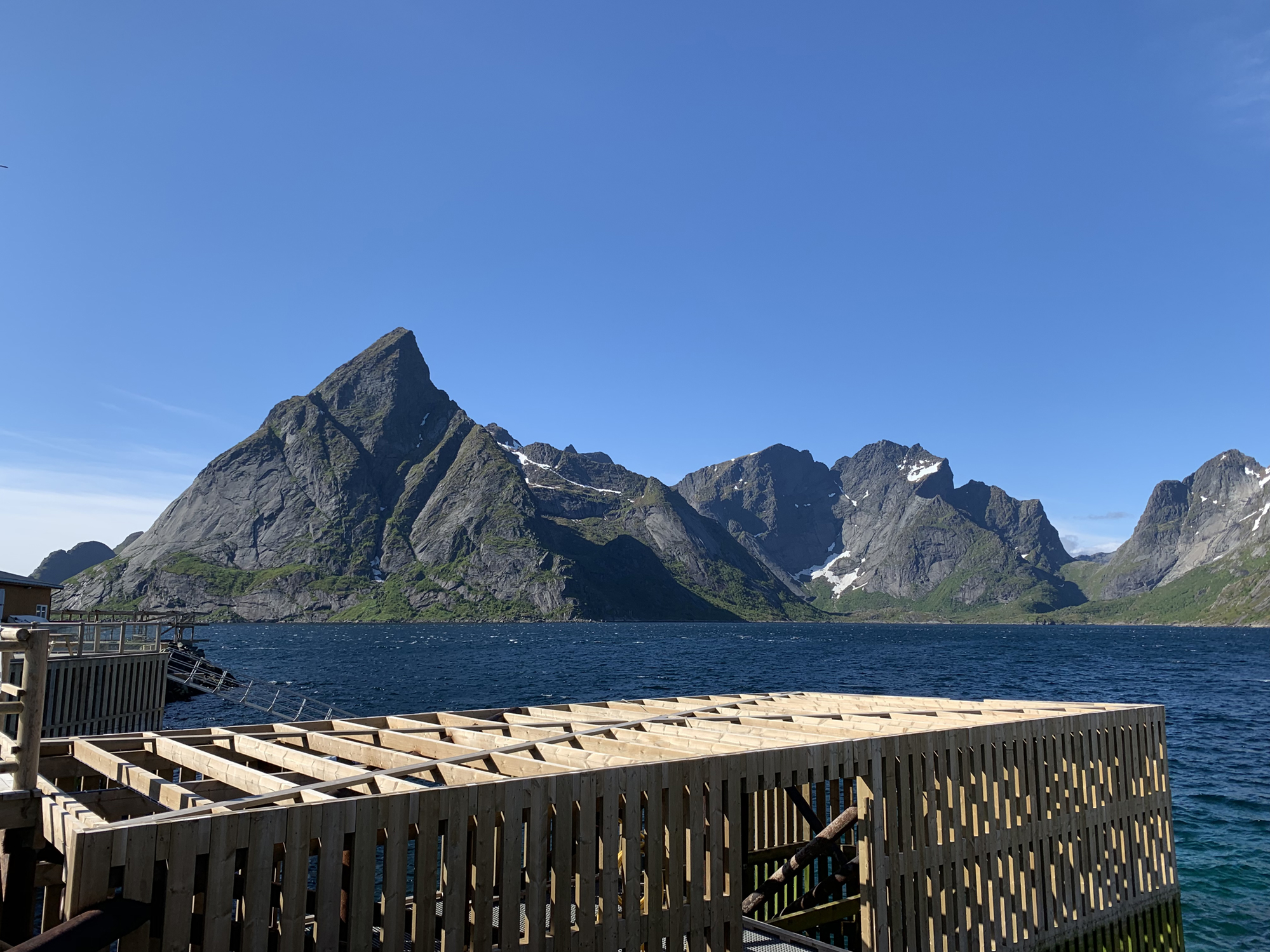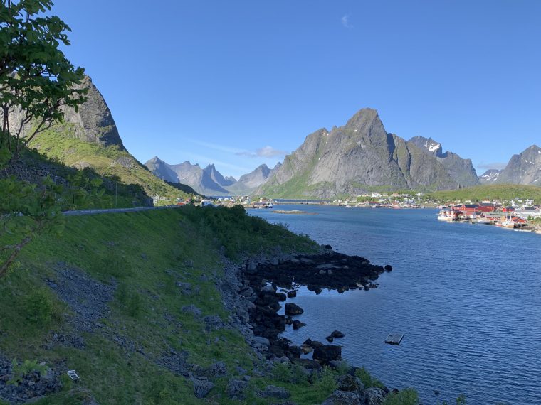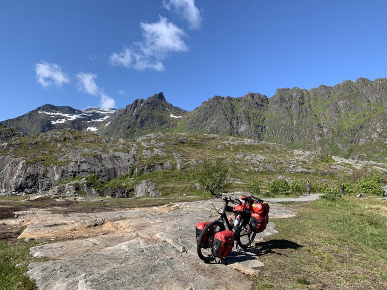 The view outside the window over Reinefjord with the triangle-shaped Olstinden landmark back-lighted by the evening sun in the background was more than a reward for the past weeks of cycling.