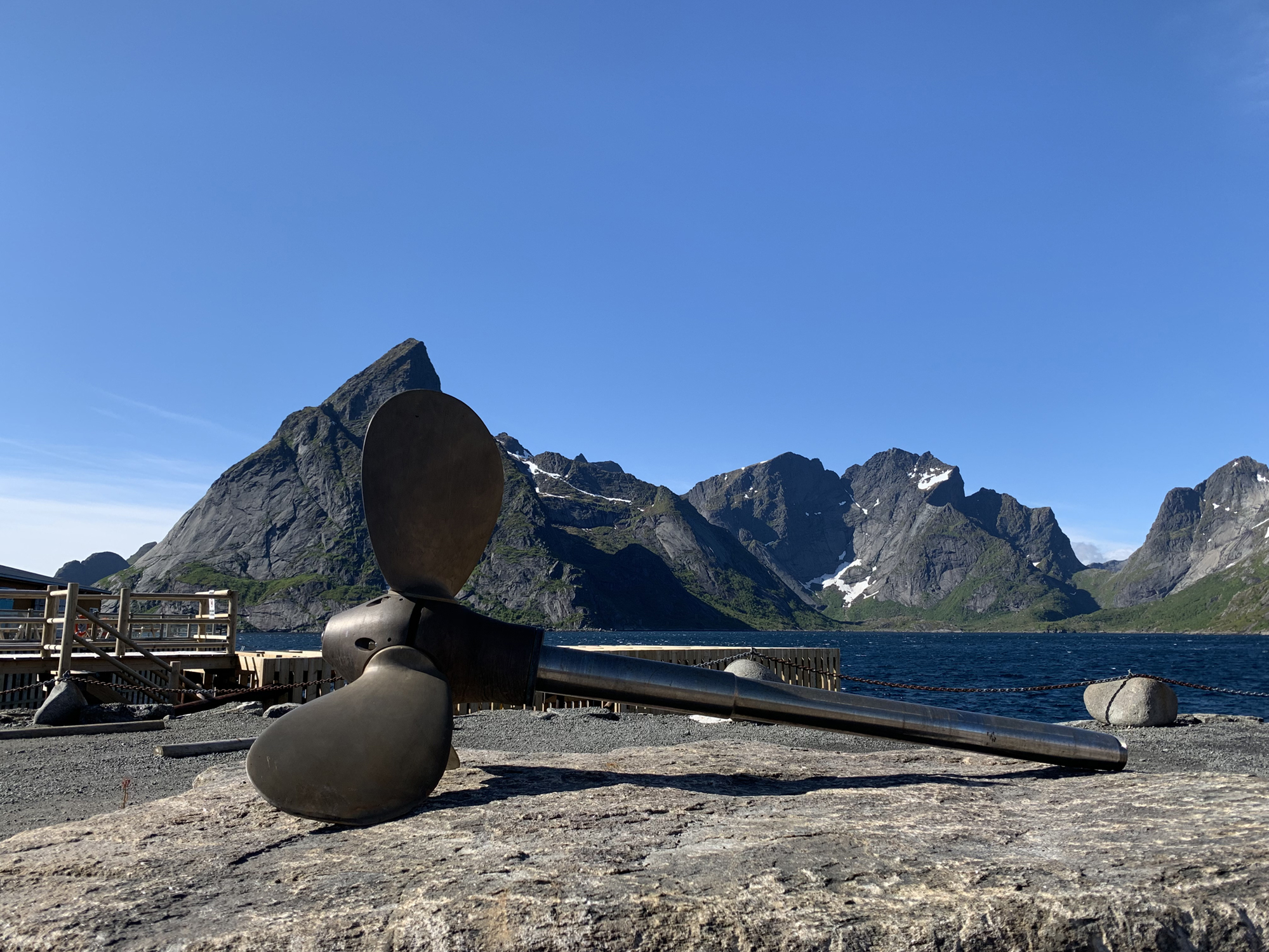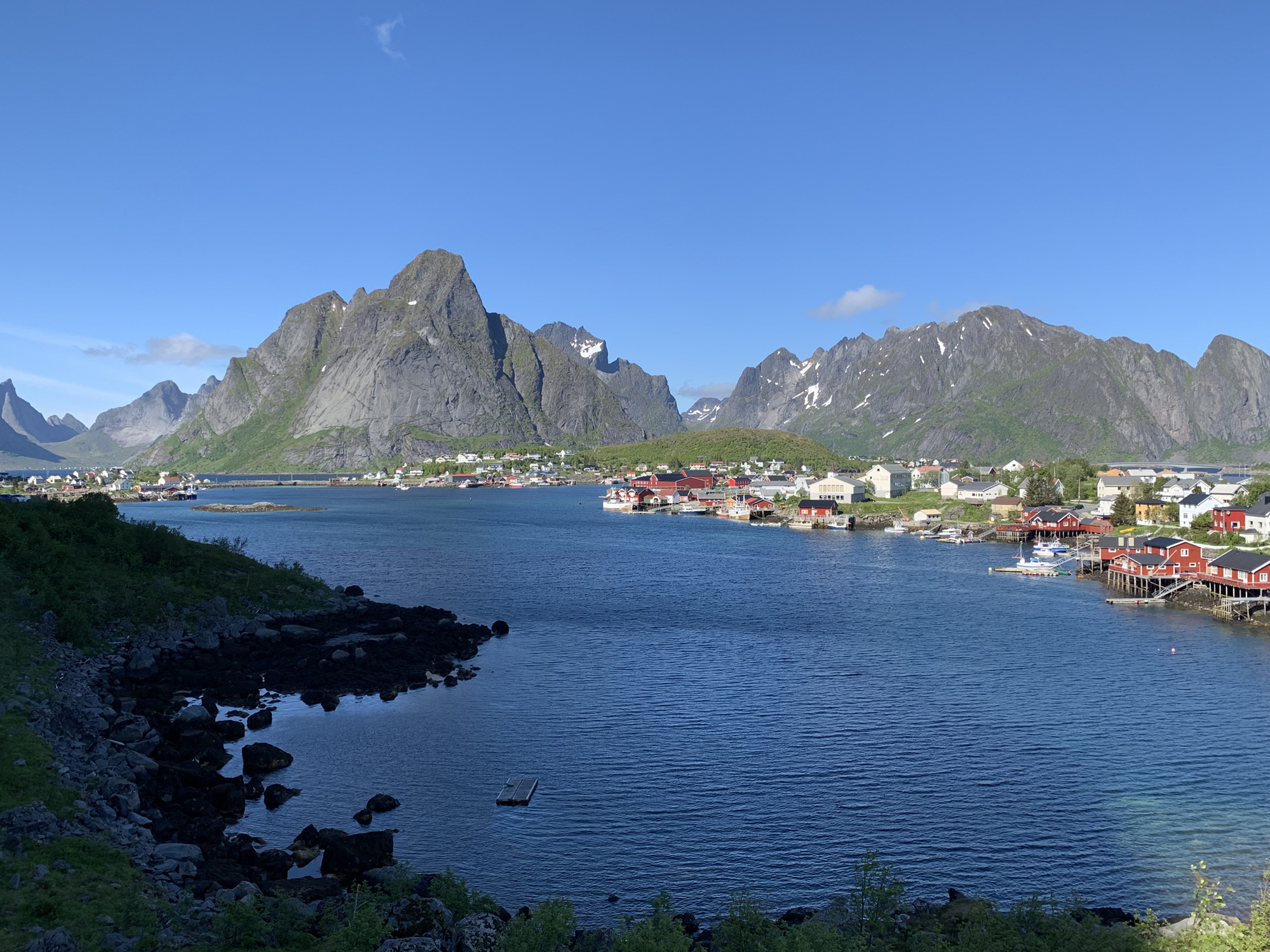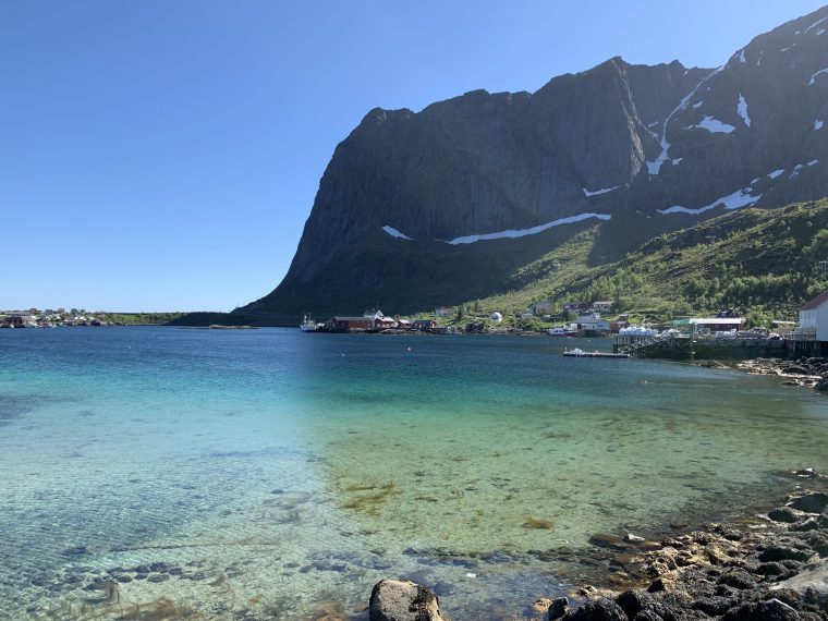The view outside the window over Reinefjord with the triangle-shaped Olstinden landmark back-lighted by the evening sun in the background was more than a reward for the past weeks of cycling.