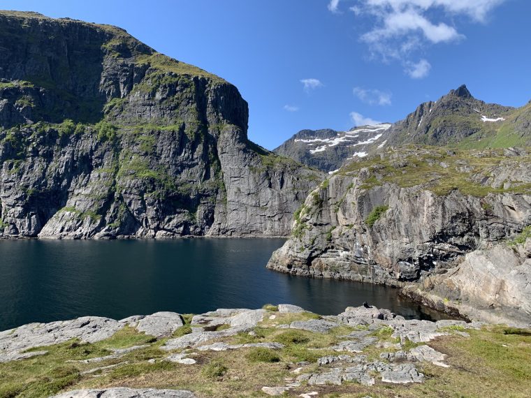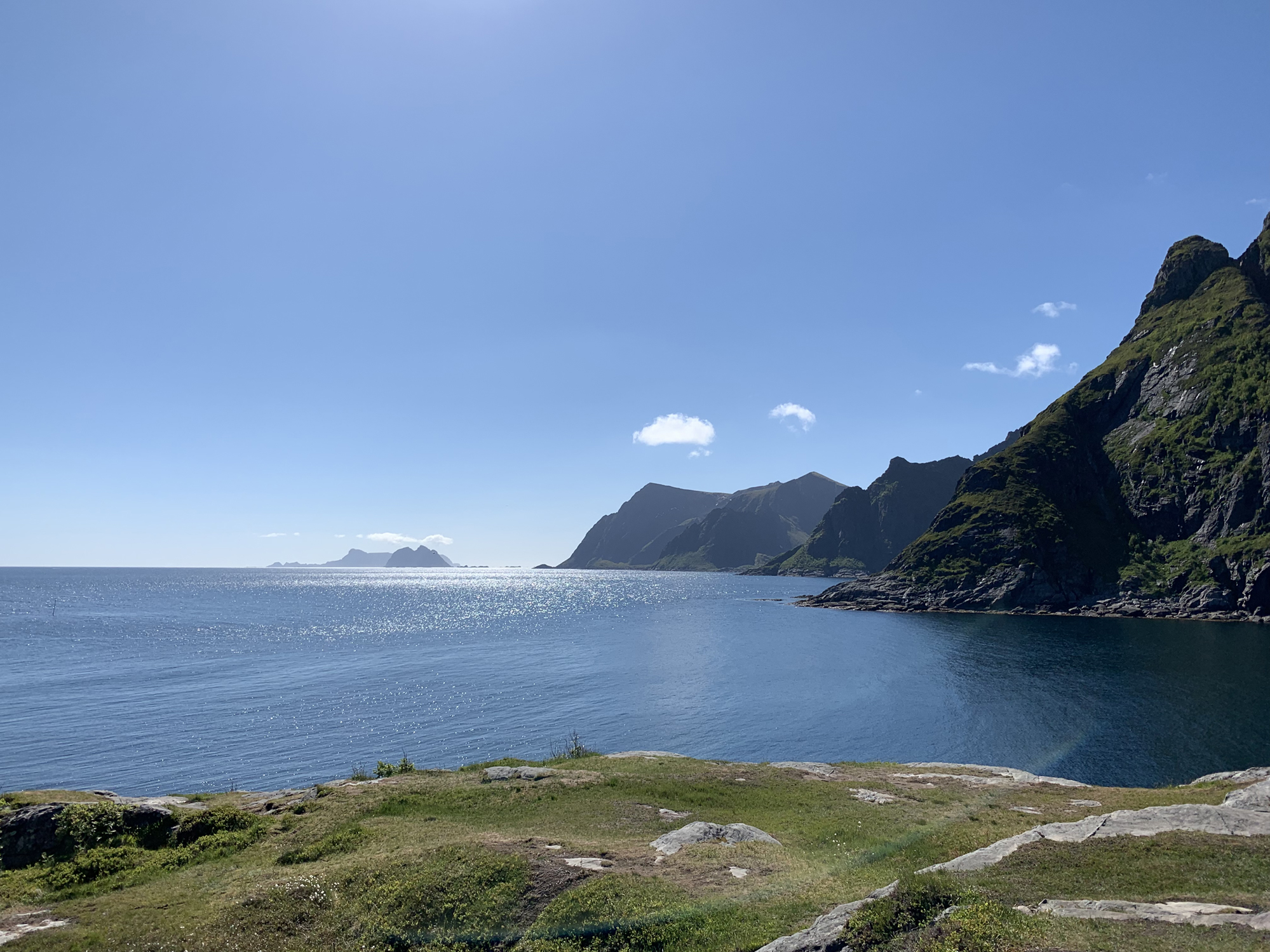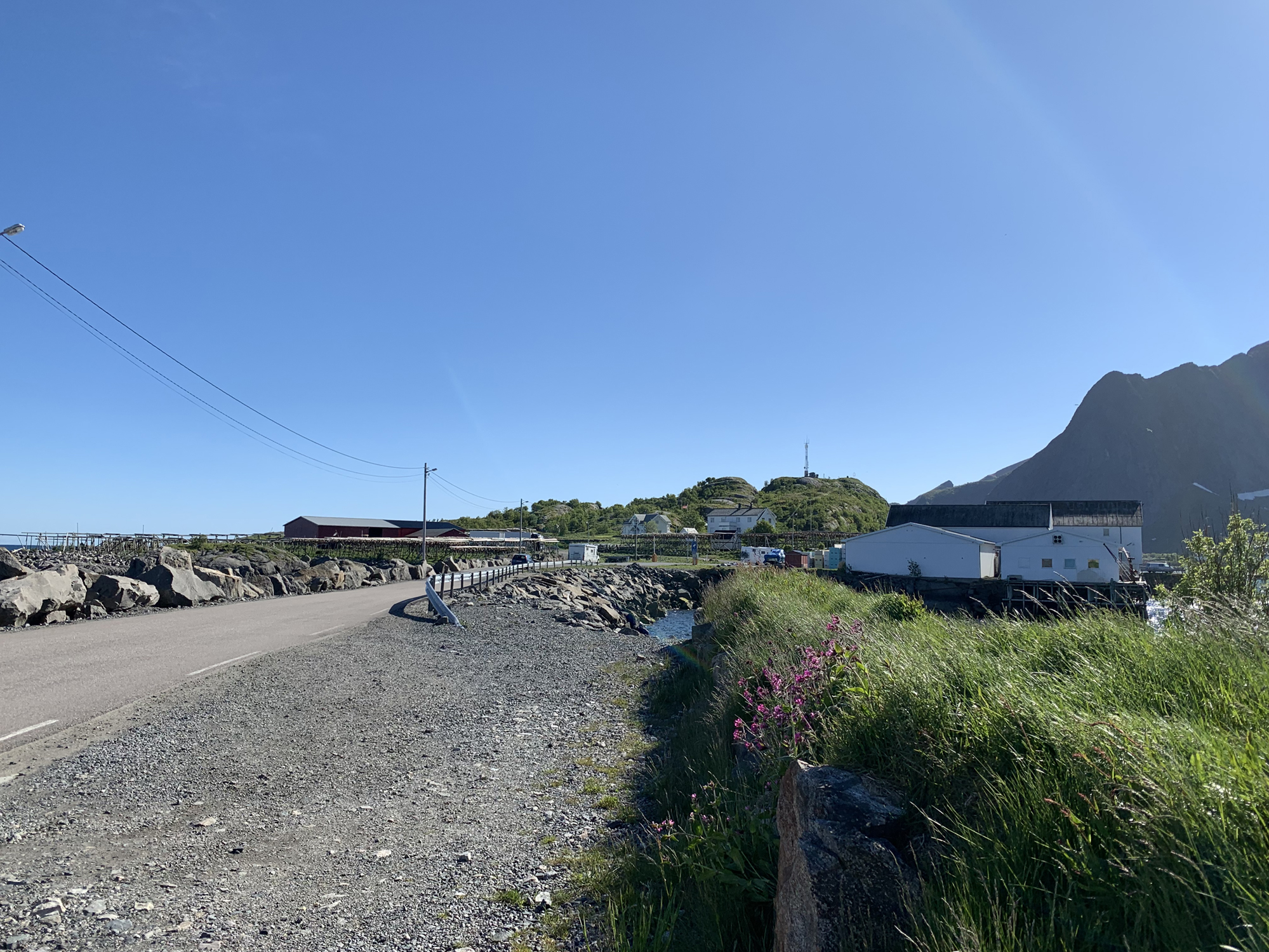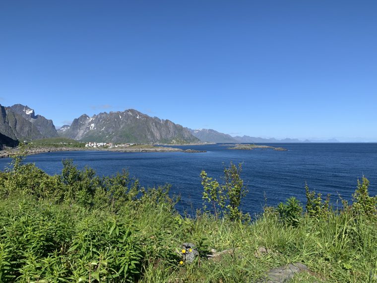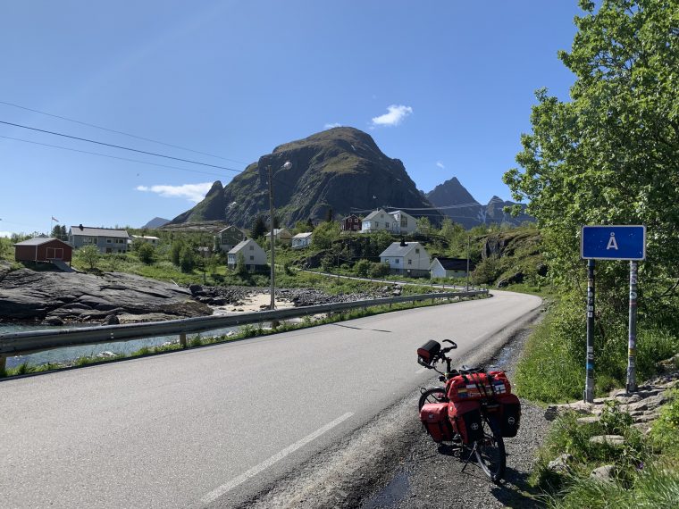 The weather was as forecasted: blue sky and sunshine around the clock. The crossing took about 2h30′. We came ashore on Lofoten around 1.30pm. Leaving the port of Moskenes I turned southwestward on the E10 toward Å where the narrow road ended on a car park. I continued on a cycleway which led me to a beautiful scenic viewpoint at the sea. It marked the beginning of an unforgettable week on the islands peppered with beautiful sceneries.