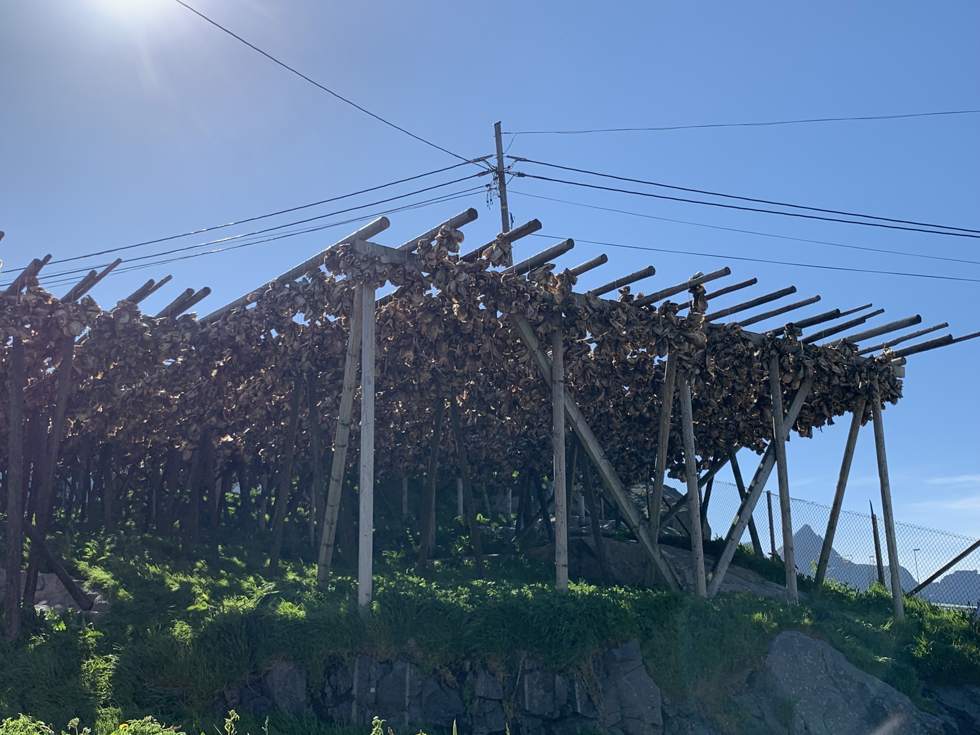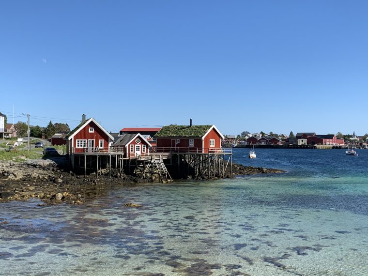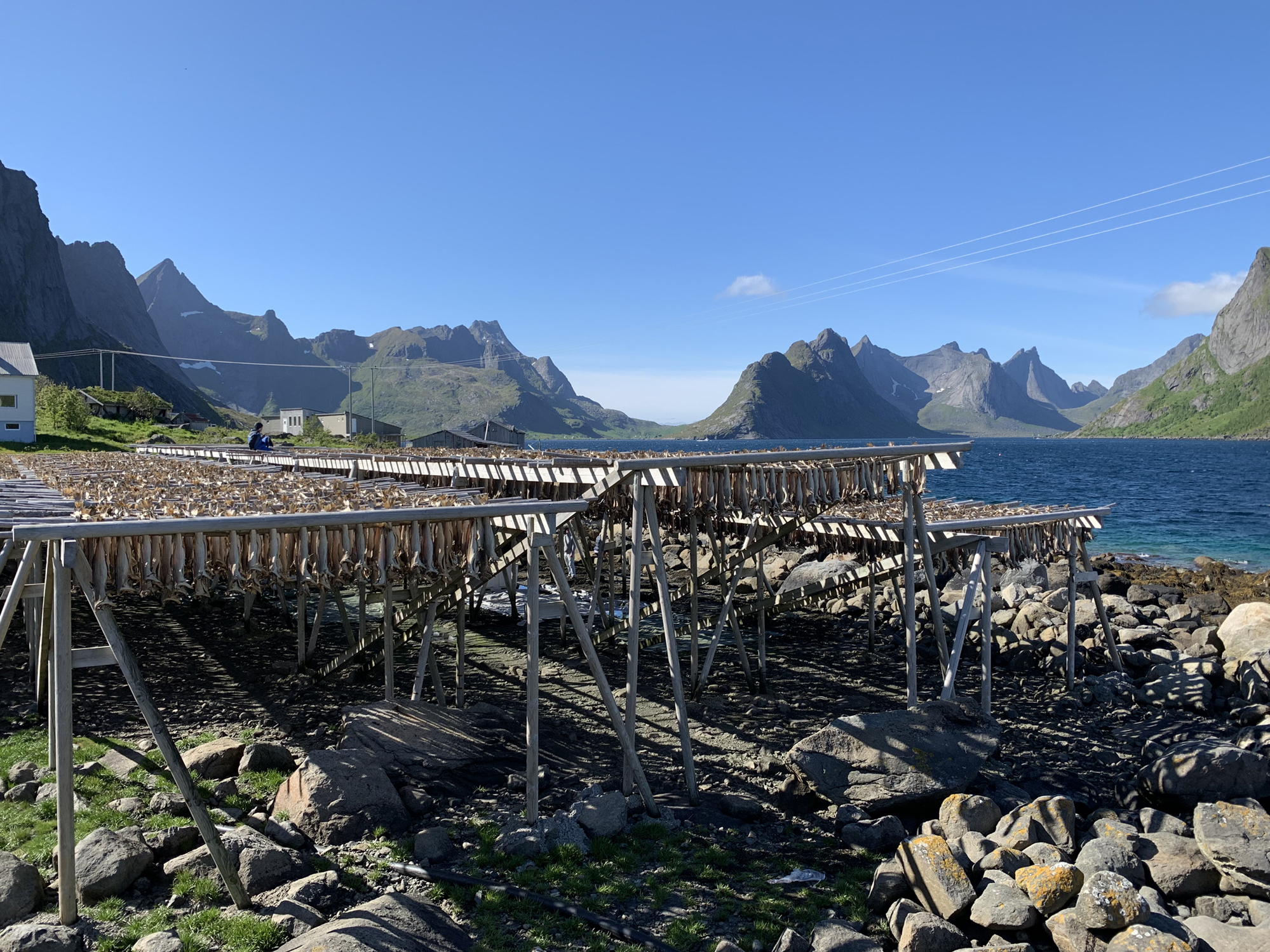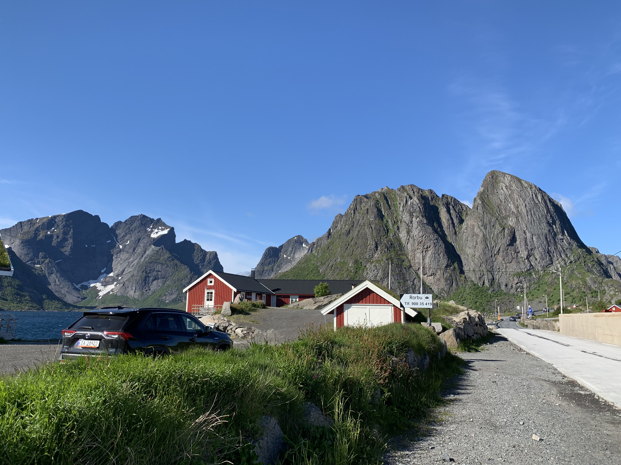 I turned back, rejoined the E10 road toward Reine, where I had to stop to memorize the scenery and take a few pictures. But after a while, I knew that every turn of the road would open on another scenic view, another fishing village with its picturesque red-painted rorbuer (fishermen cabins), scaffoldlike cod-drying racks covering nearly every rocky knoll in front of razor-sharp mountain peaks bathed in the light of a radiant sun under a bright blue sky, batten by a fresh wind with scents of dried fish and sea iodine.