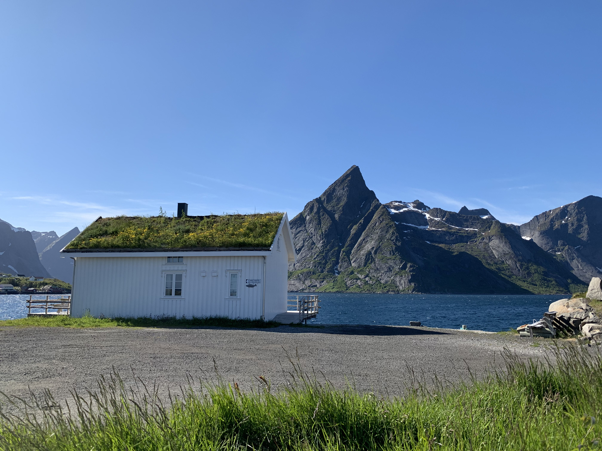 I had booked a room in the “Manor House” on Hamnøy and received a code to open the frontdoor of the house, but it did not worked and I had to call the landlord, who remotely opened the door. I easily found my room upstairs with a great view over the fjord and sharp mountain peaks behind. I took a shower, drop my dirty clothes in the washing machine and prepared my dinner. New guests arrived Two young women from Vladivostok who joined me in the kitchen. They had flown from home to Moscow and travelled to Scandinavia by car.