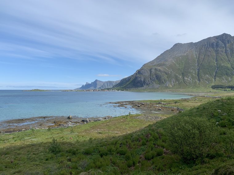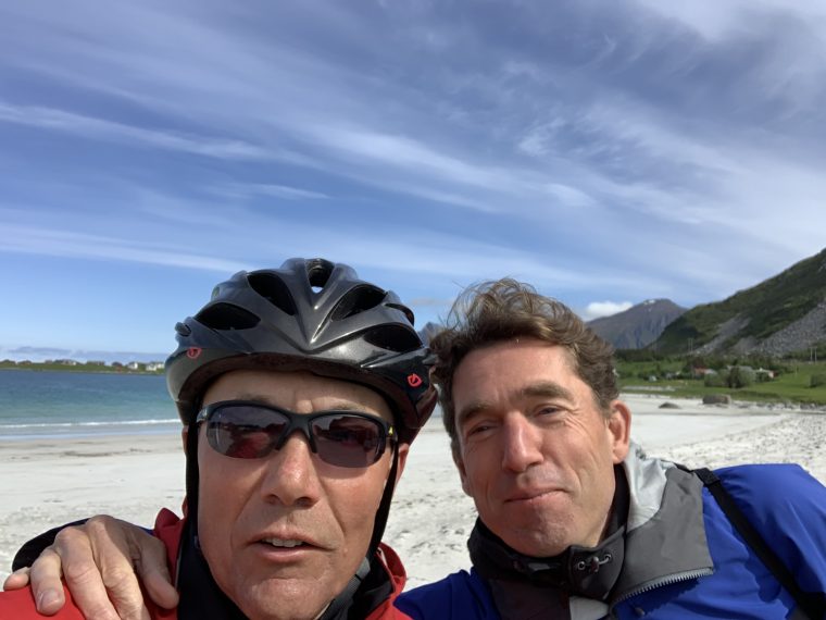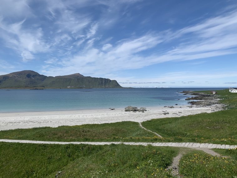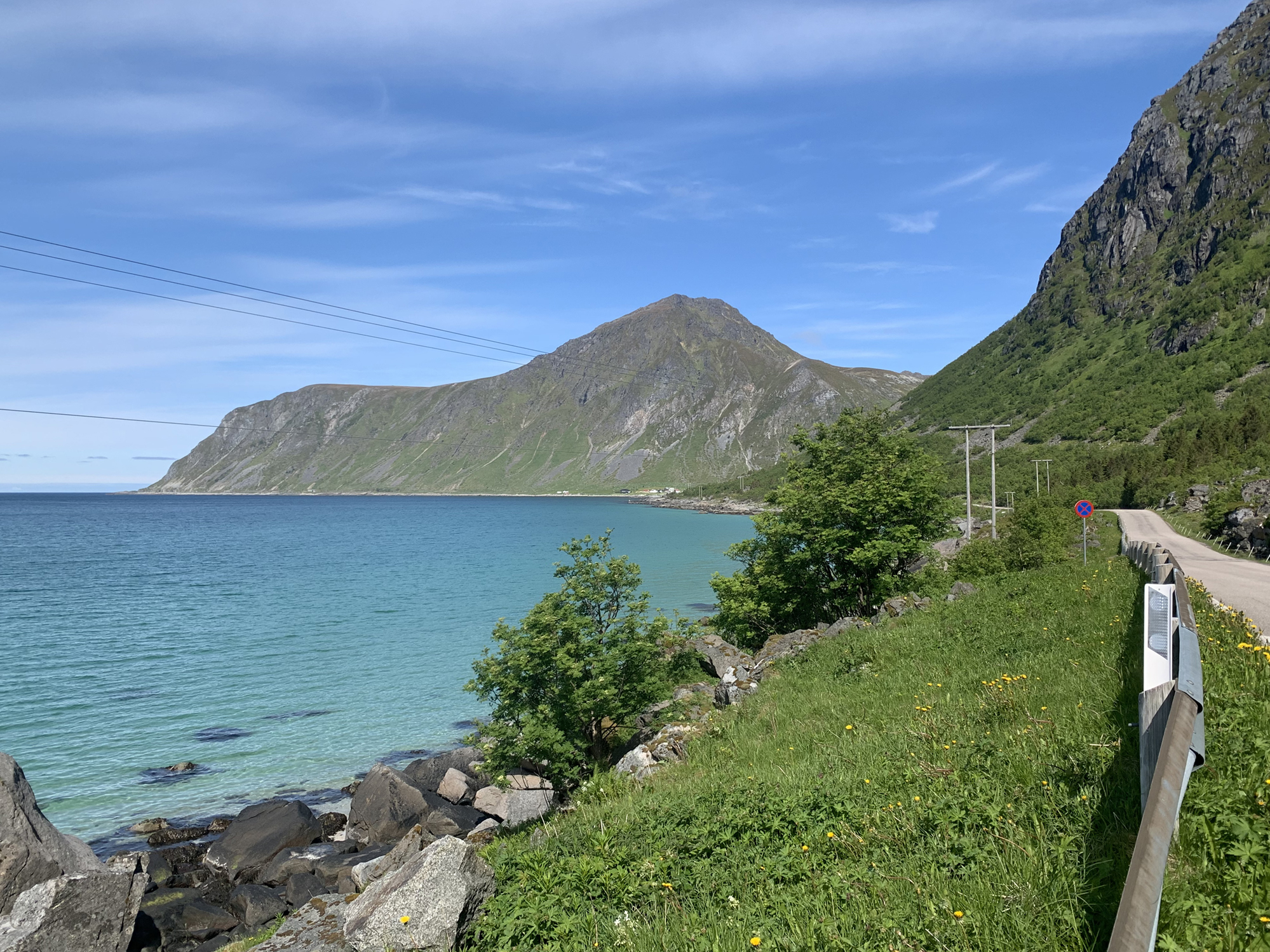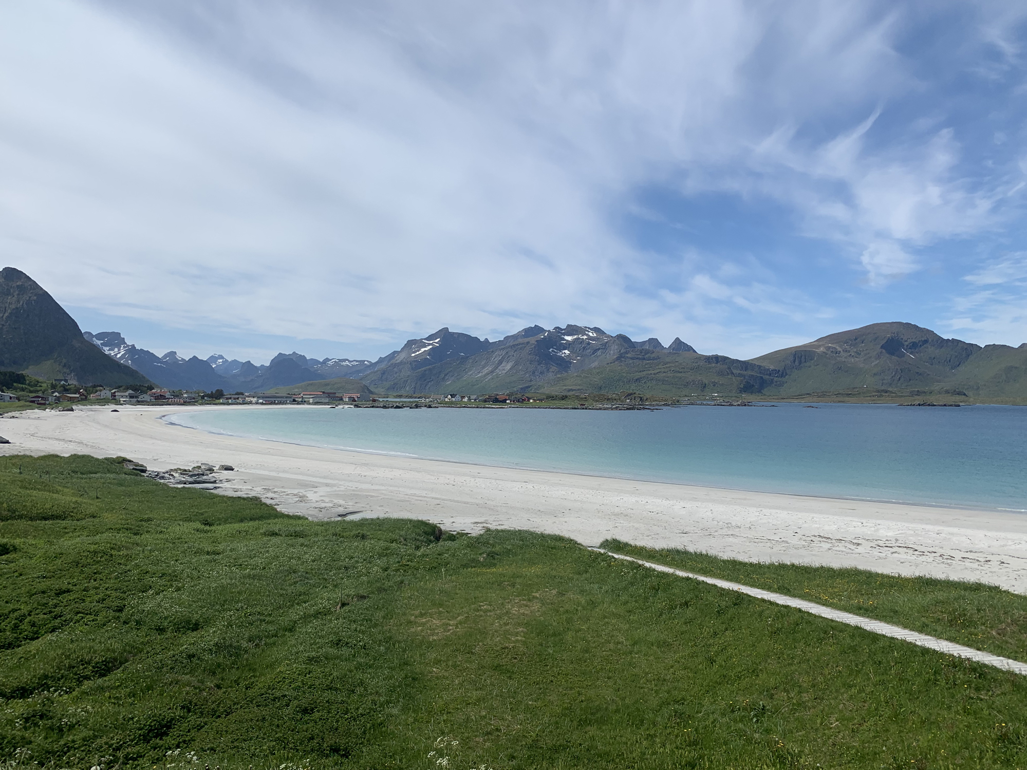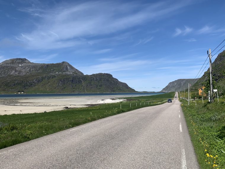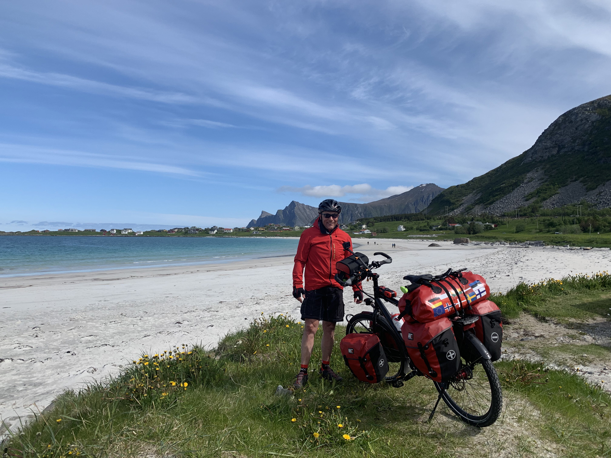 Day 29 At 9am I was ready to leave the lodge with perfect cycling weather despite a fresh wind blowing from the North with 24 to 35 km/h. Heading northward I passed the Kåkern Bridge (Kåkernbrua) linking the islands of Moskenesøya and Flakstadøya and reached Ramberg around 11.15am. In the village I saw a fellow dutch cyclist I had met on the ferry and who had spent the night at a nearby camping site. We walked to the beach and had a talk. Ramberg Beach (Rambergstranda) is one of the most beautiful beaches in the Lofoten Islands: a crescent of white sands washed by crystal clear turquoise water.