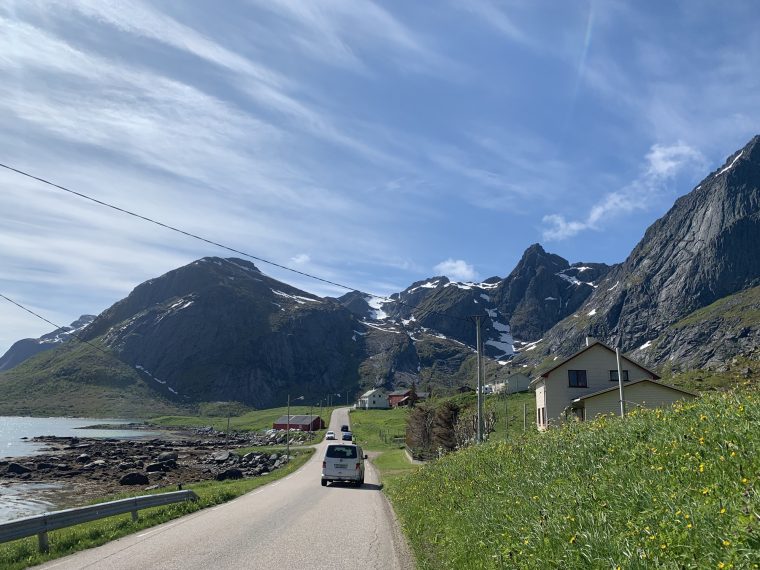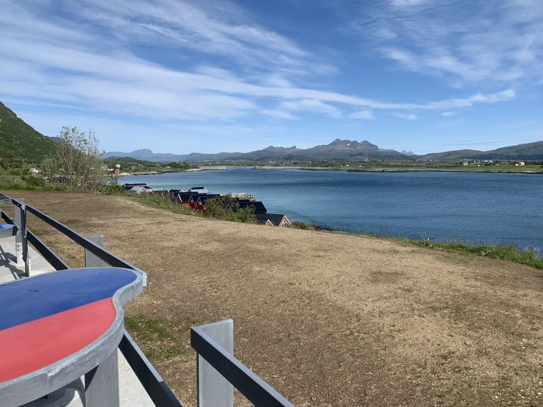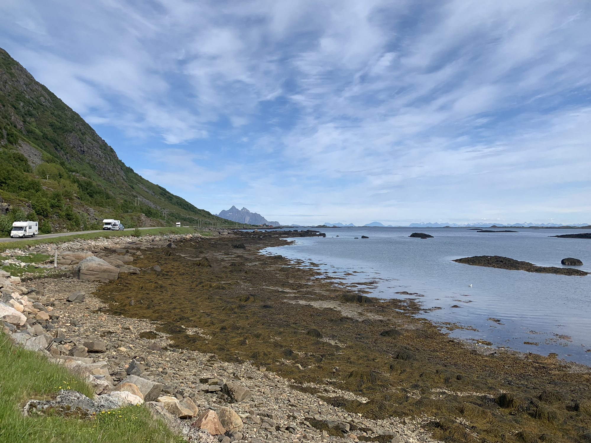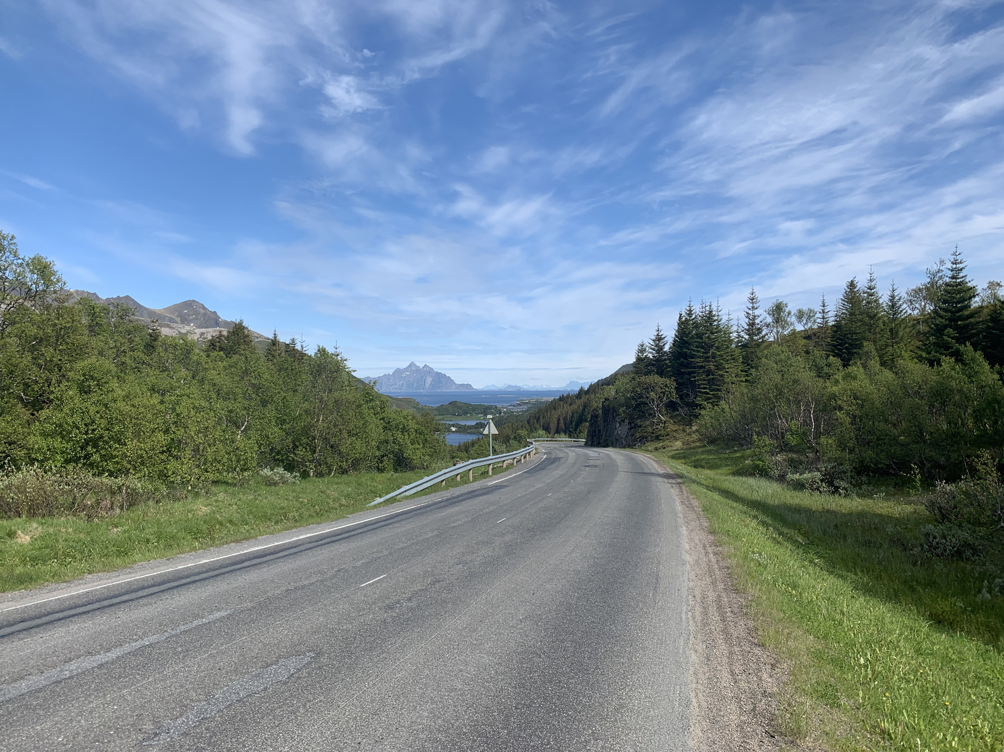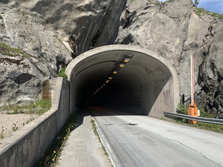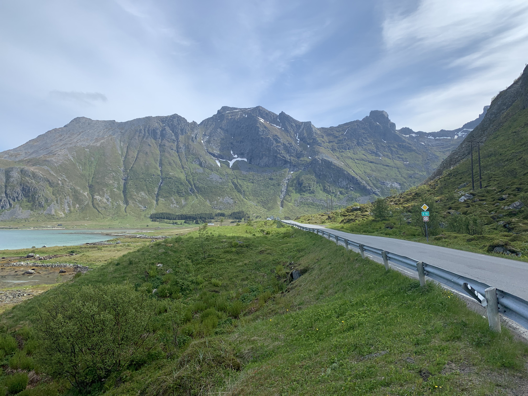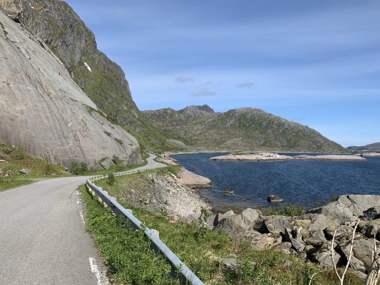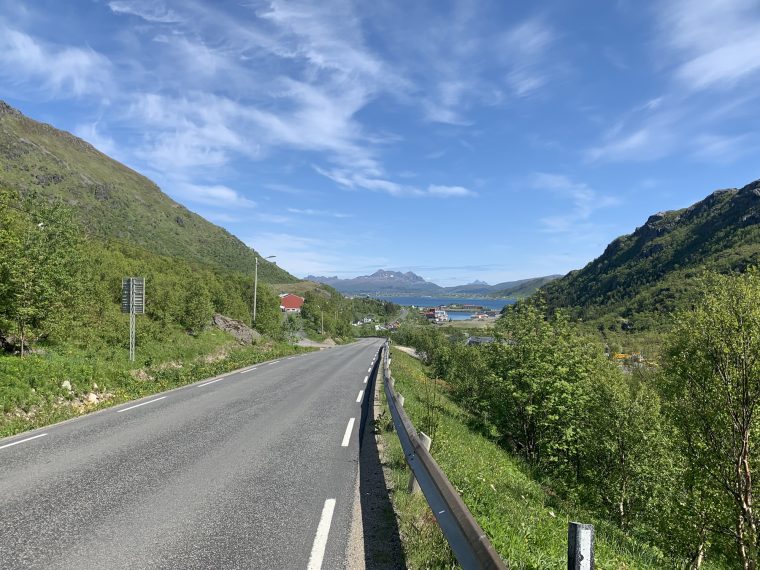 After having said goodbye, I continued my trip on the E10. About one hour later, I arrived at the entrance of the Nappstraum Tunnel (Nappstraumtunnelen), a 1,776 m long and up to 63 m deep undersea road tunnel connecting the islands of Flakstadøya and Vestvågøya. I moved to the left side of the road and entered the tunnel on a narrow sidewalk. Because of the steep descent, I had to concentrate to avoid touching the sidewall of the tunnel with the left panniers or sliding off the raised sidewalk, oncoming traffic passing very close. I reached the bottom of the tunnel and had to push my bike in the ascent. I eventually came out of the tunnel, breathing the fresh air with relief. A somehow scary experience.