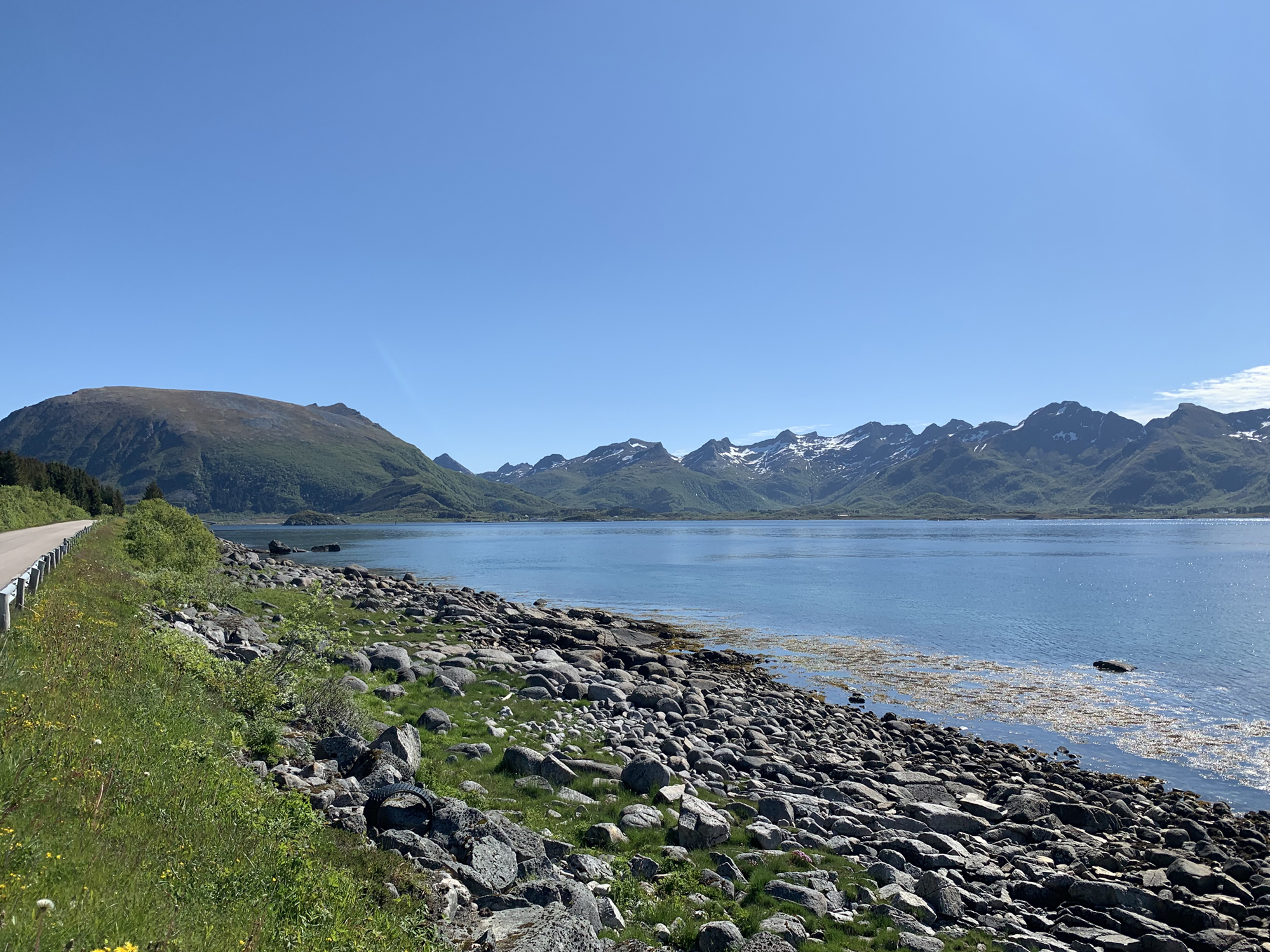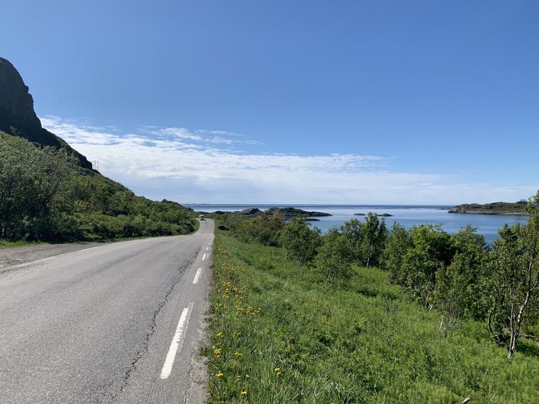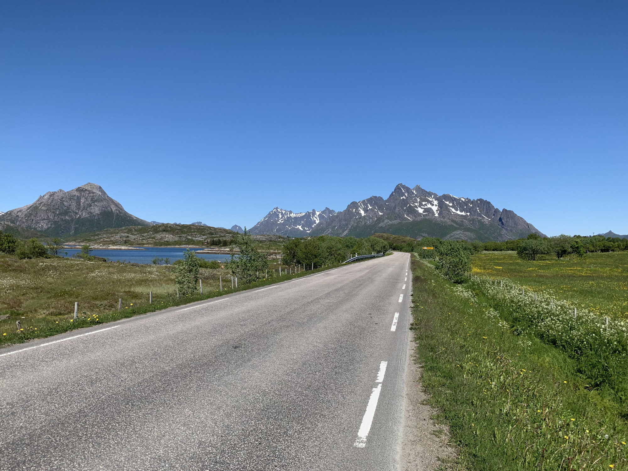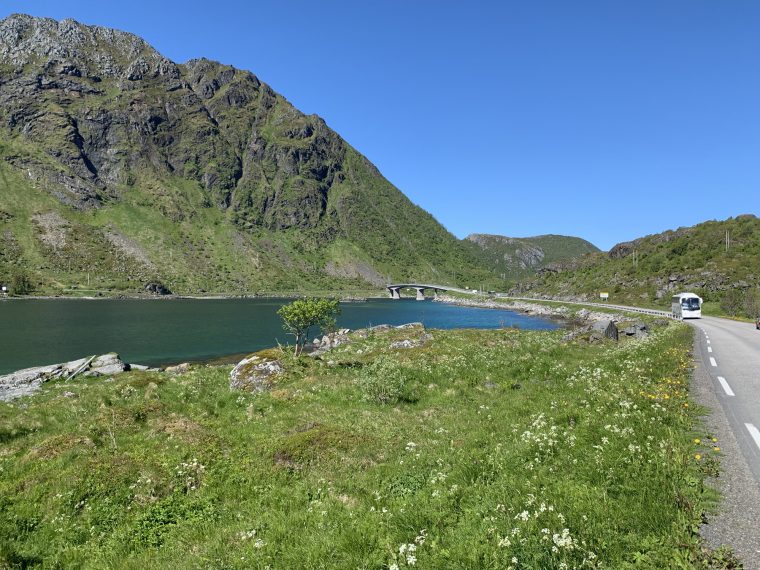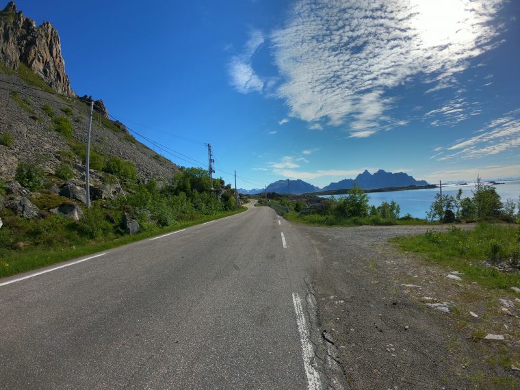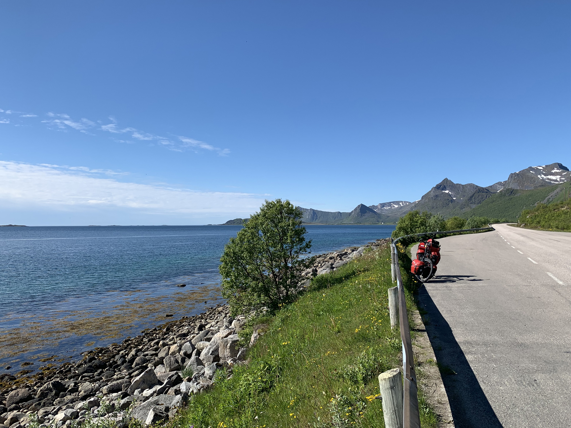 Day 30 Another day of island hopping. I left the camping site around 9am with sunshine and mild 12°C, heading northward on road 815. After 20 km the road ended in mainroad E10 and I passed the Sundklakk Bridge (Sundklakkbrua) connecting Vestvågøya and Gimsøya.