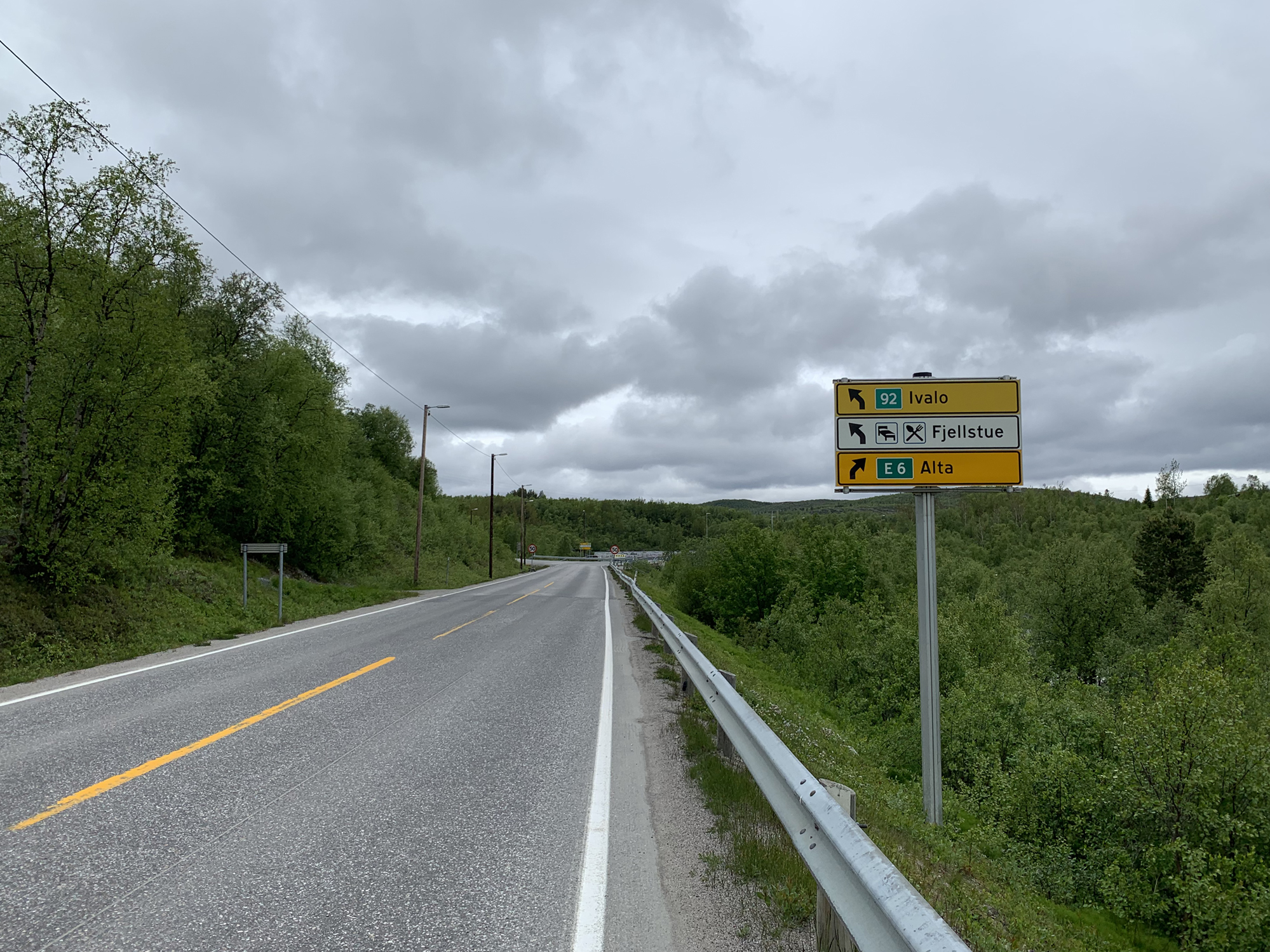 Day 44 It was cloudy but dry as I left Kirkenes. I headed westward on the E6 back to Nordkapp for 40 km. In Neiden I turned southward onto road 893 and crossed the norvegian-finnish border after 10 km.