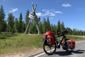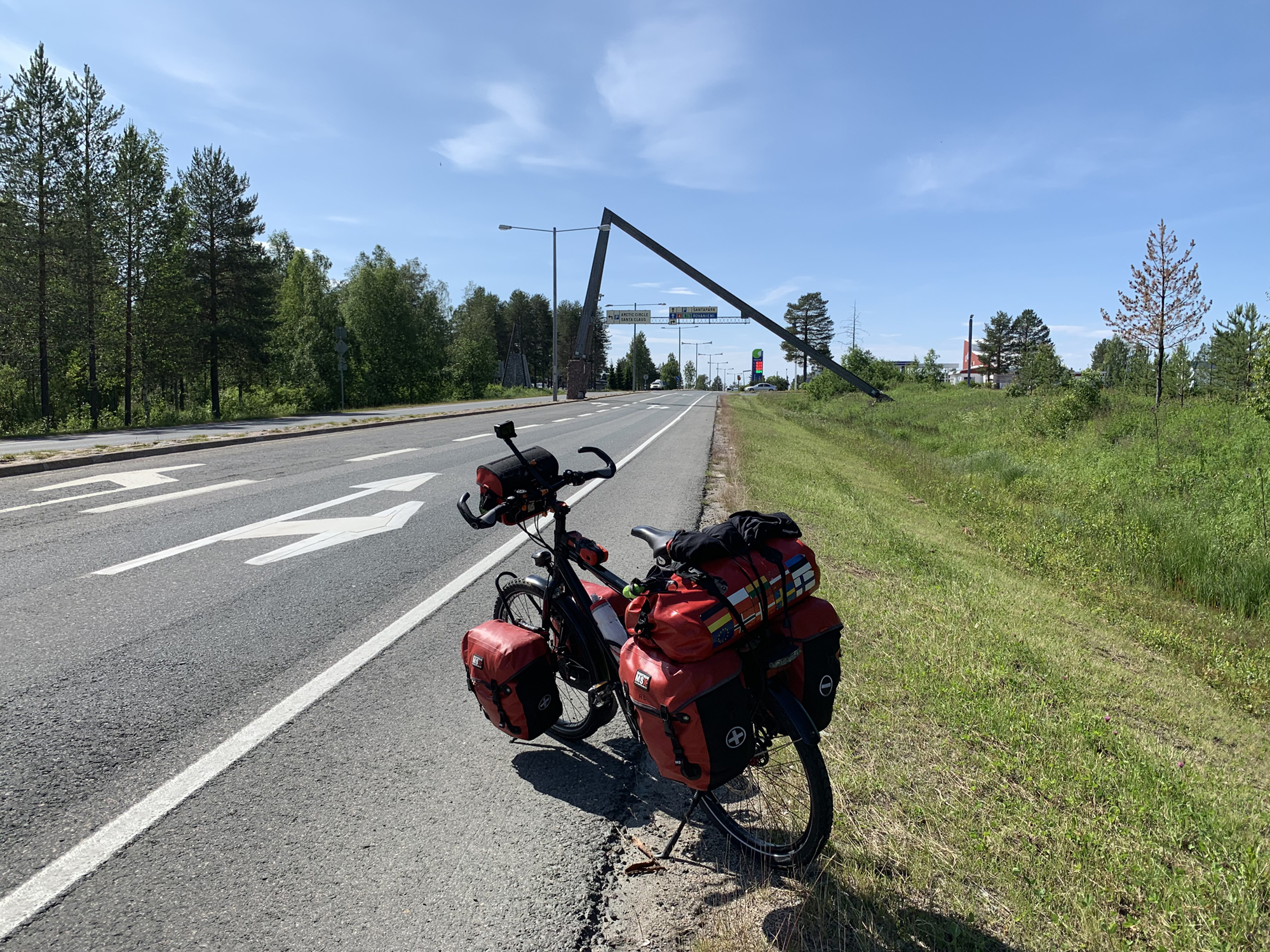 Day 56 I left Kemijärvi at 8:20 under a cloudy sky and with a fresh wind from NNE at 12°. After a while the sun came out and as I arrived in Rovaniemi, temperature had raised to 20°. It has been another easy ride with moderate slopes. But the drawback of the raising temperature is that horse and dear flies made their apparition and began to chase me. If you ever have been chased by a swarm of dear flies, you know what I mean and that the only chance you have to avoid getting bitten, is to escape as fast as possible. For my lunch stop, I wanted to avoid the unfriendly insects and found a picnic place on a well-kept lawn in the middle of a village.